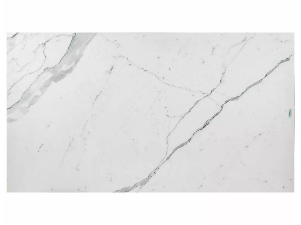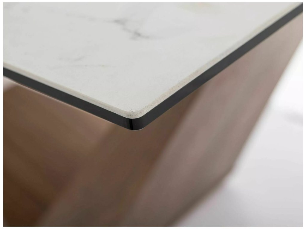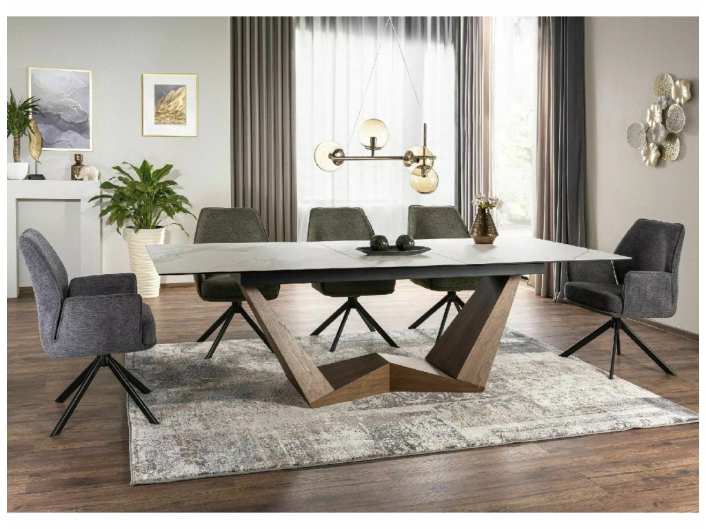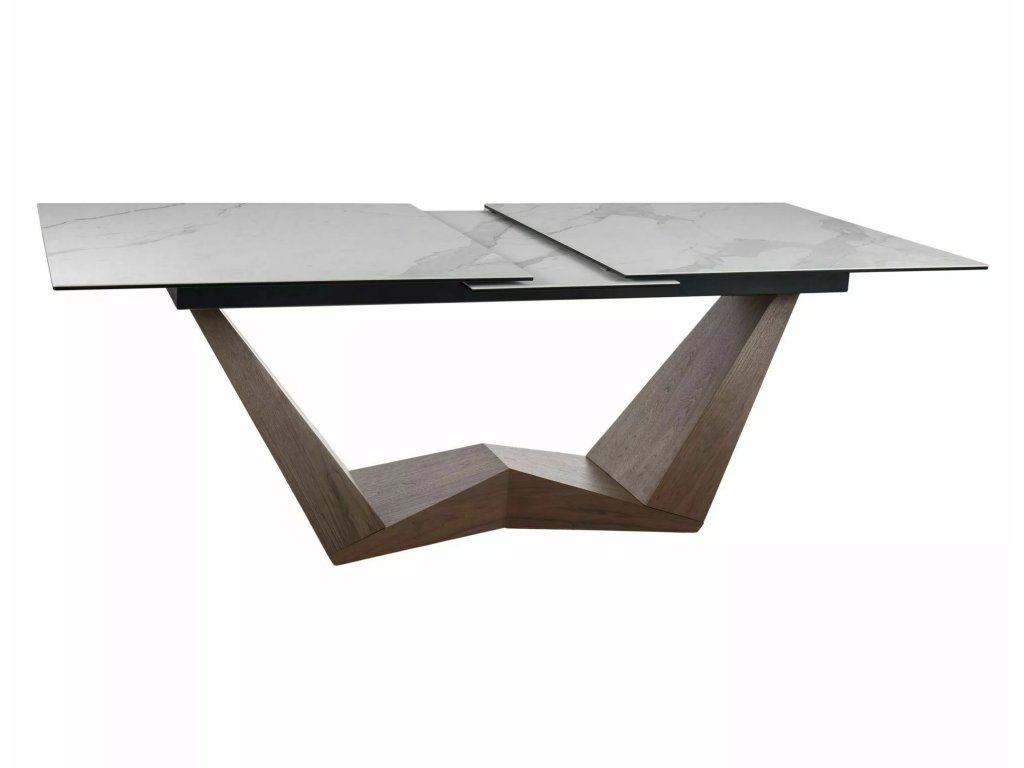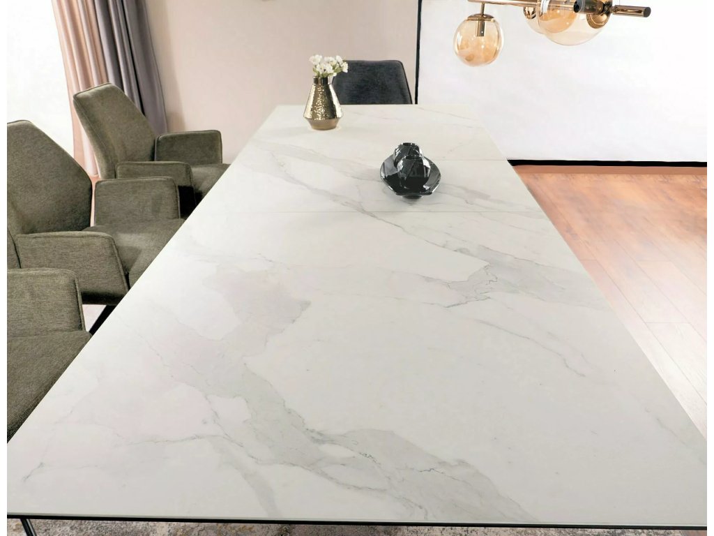 Rozkládací stůl, deska: tvrzené sklo + keramika STATUARIO VENATO, rám: kov, barva: matná bílá / ořech.