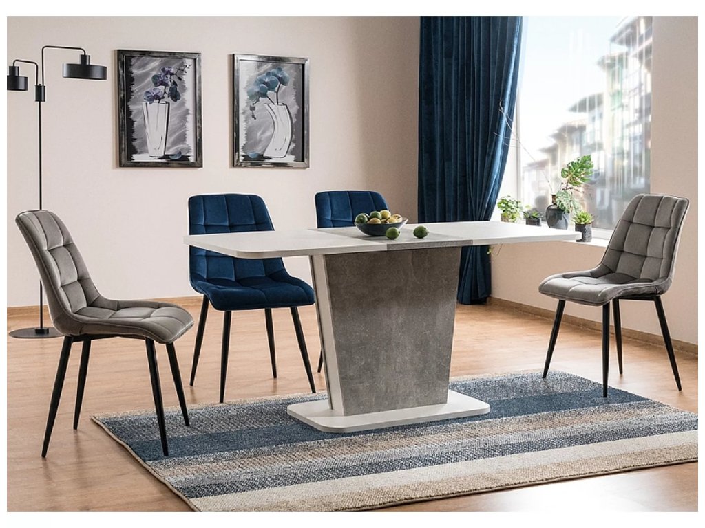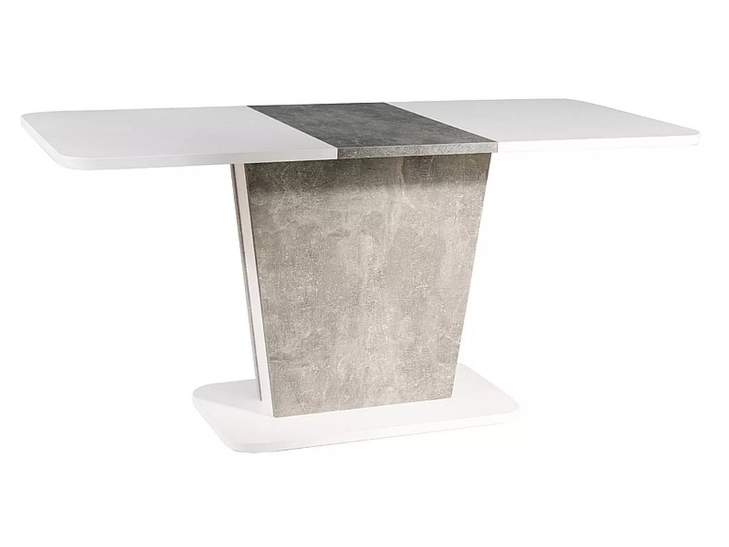 Rozkládací stůl, deska: lamino, rám: lamino, barva: matná bílá / betonový efekt. Další deska je skryta v noze.