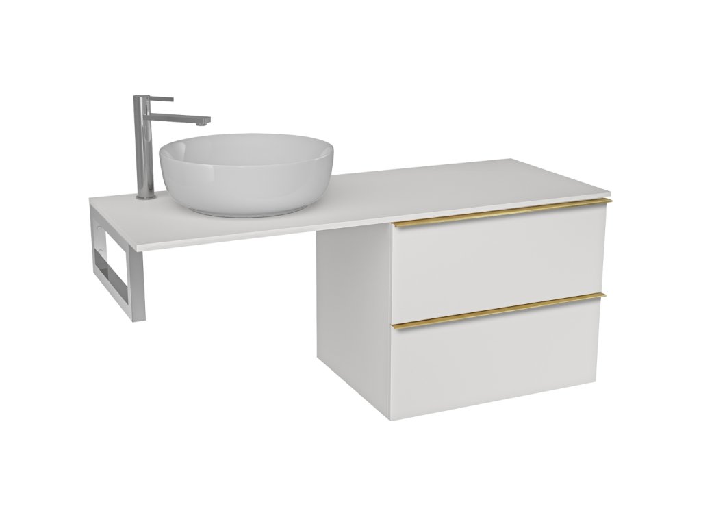 CERANO - Deska pod umyvadlo z litého mramoru Elanys - 140x46,5x1,2 cm - skříňka Velora 69 cm - bílá matná, zlatá úchytka - konzole chrom