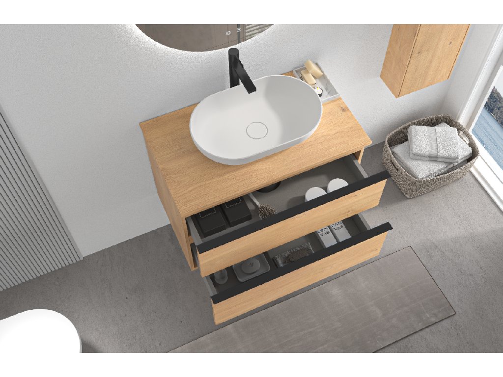 Koupelnové skříňky jsou vyrobeny z MDF lamina (středně hustá dřevovláknitá deska) s nalisovanou melaminovou fólií, která je odolná vůči vlhkosti, poškrábání, UV záření a běžným čisticím prostředkům. Povrch je hladký, tvrdý, homogenní a snadno se čistí. MDF desky se nekroutí jako masivní dřevo. Pokud dojde k mechanickému narušení laminace, samotné MDF jádro může navlhnout.