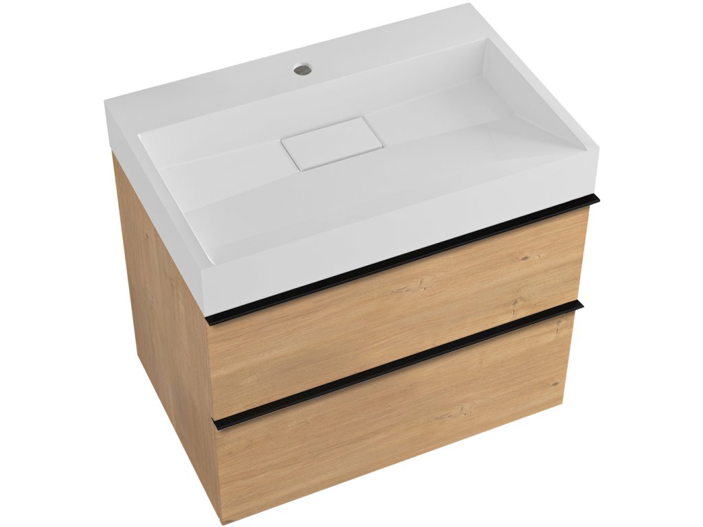 CERANO - Koupelnová skříňka Velora - dub medový - úchytka černá + umyvadlo s otvorem pro baterii z litého mramoru Vita - bílá lesklá - 70x53x46 cm