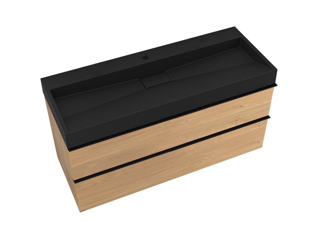 CERANO - Koupelnová skříňka Velora - dub medový - úchytka černá + umyvadlo s otvorem pro baterii z litého mramoru Vita - černá - 100x53x46 cm