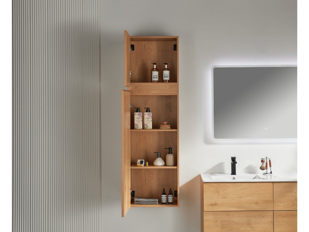 Každá skříňka je vybavena praktickým úložným prostorem, který vám umožní efektivně uspořádat vaše koupelnové potřeby. Díky nastavitelným policím v horní části můžete využít skříňku k uložení vyšších předmětů. Takže budete mít vše na dosah a přehledně uspořádané.