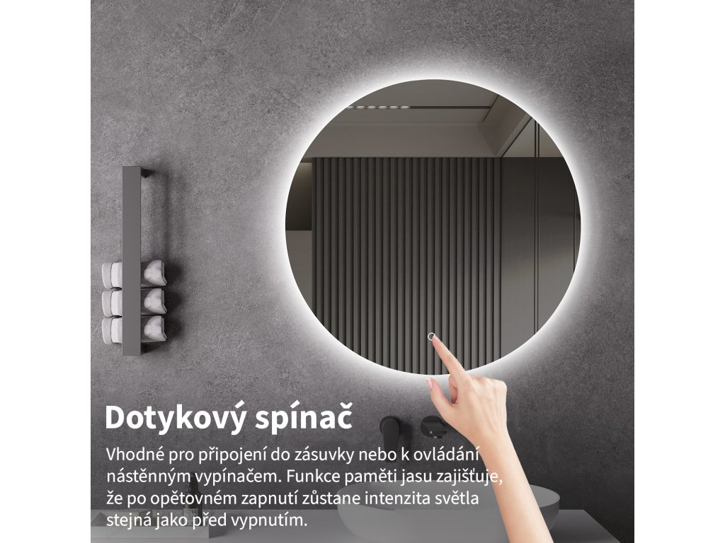 Osvětlení zrcadla lze snadno a pohodlně zapnout dotykem přepínače na panelu zrcadla. Umožňuje rychlé nastavení osvětlení bez nutnosti sahat po vzdálenějším tradičním vypínači.