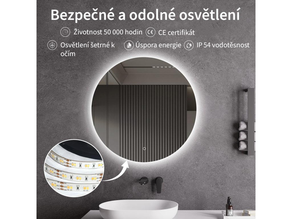 Zrcadlo je vybaveno LED osvětlením s nastavitelnou barvou světla – od 3000 K (teplá) do 6000 K (Neutrální). Přepínání barev jednoduše ovládáte dotykovým tlačítkem na ploše zrcadla. Poskytuje intenzivní a jasné světlo pro detailní péči i příjemné, jemné osvětlení pro relaxaci. Díky širokému rozsahu teploty barev tak snadno přizpůsobíte atmosféru aktuální potřebě.