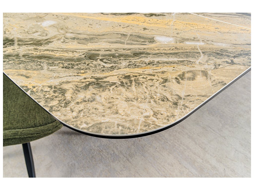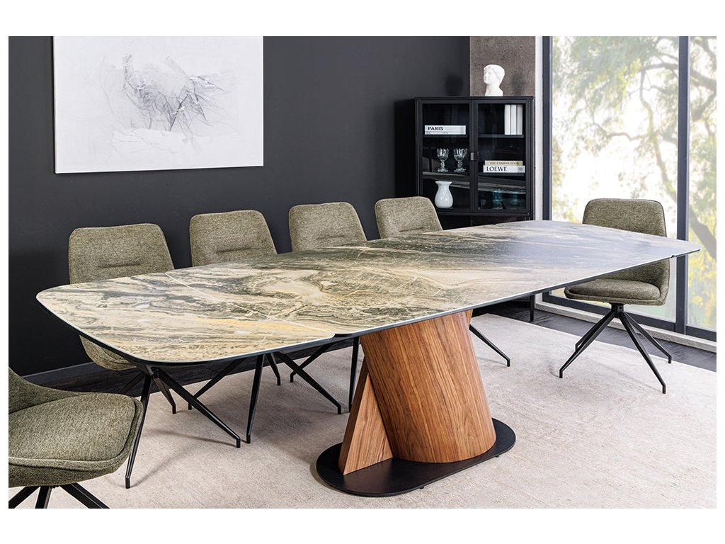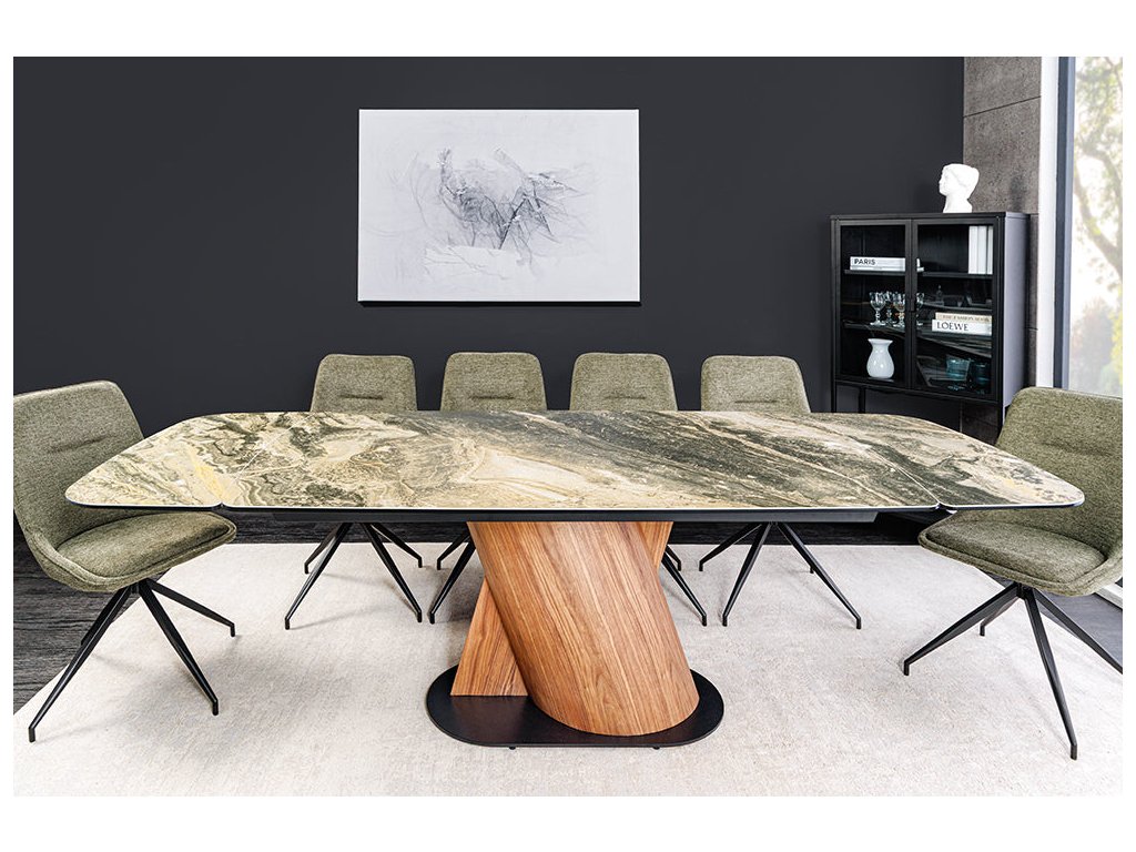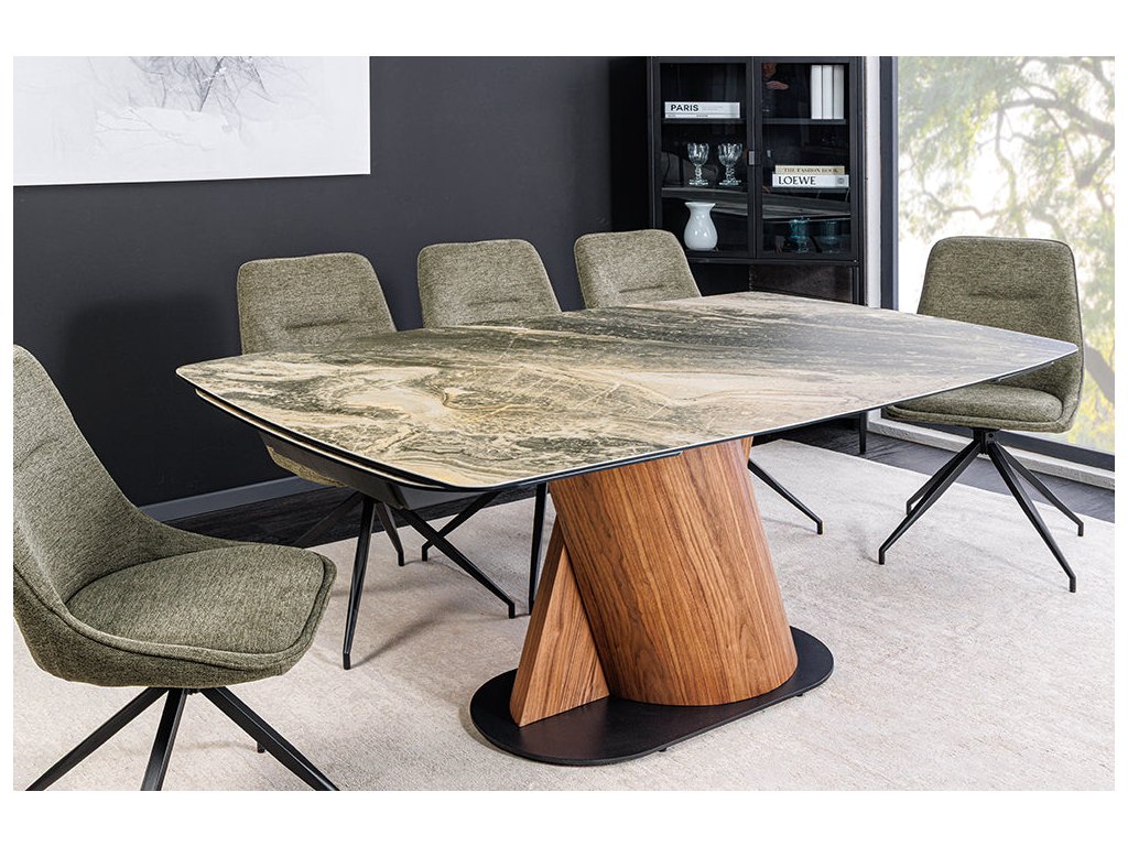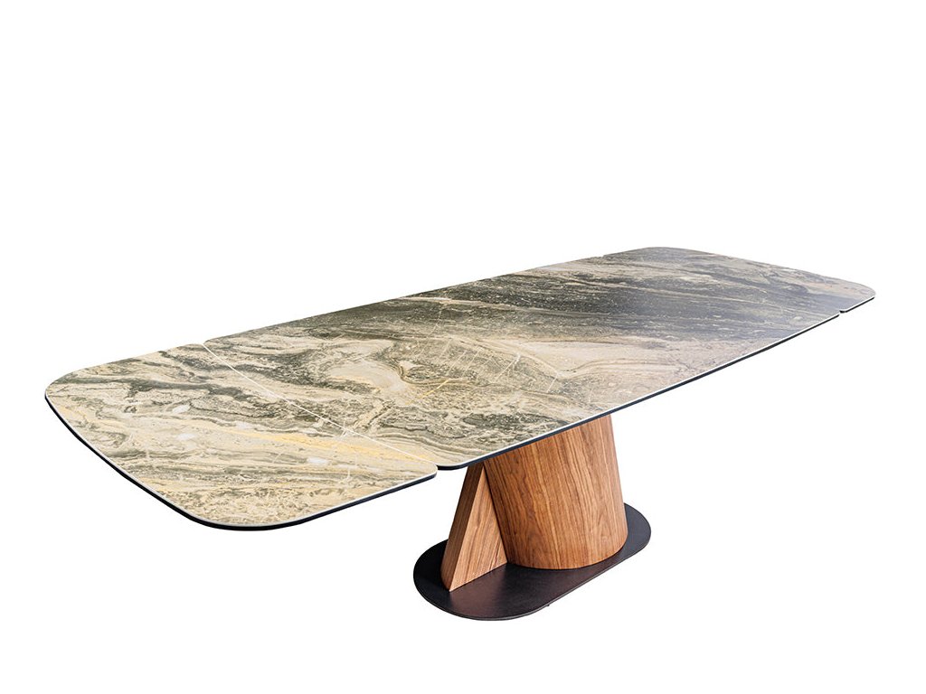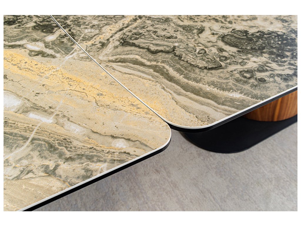 Jídelní stůl ELEMENTS 180-260 cm rozkládací, ořechový rám s keramickou deskou, taupe béžový mramorový vzhled