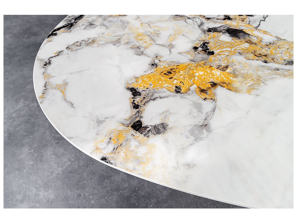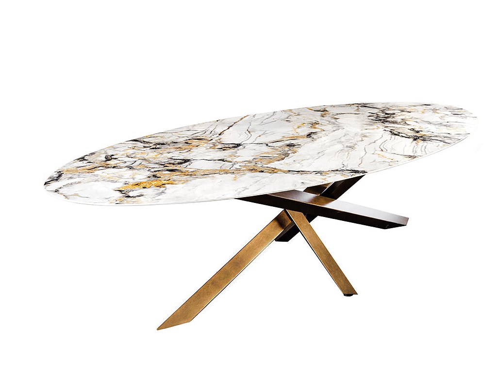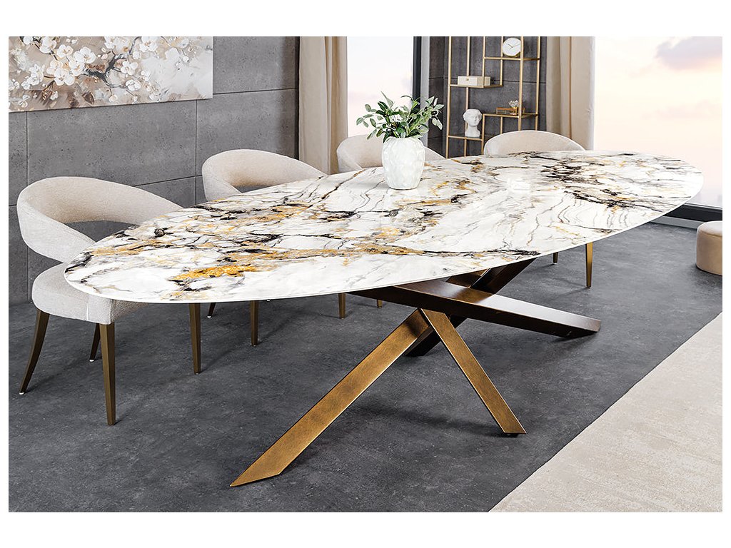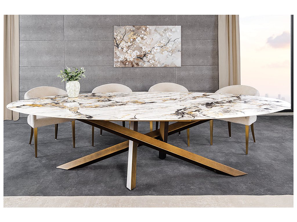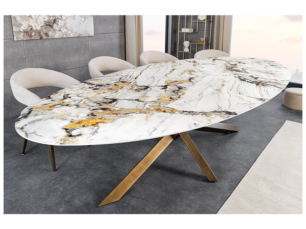Jídelní stůl SCULPTURE 280 cm, oválný bronzový rám s keramickou deskou, vícebarevný mramorový vzhled