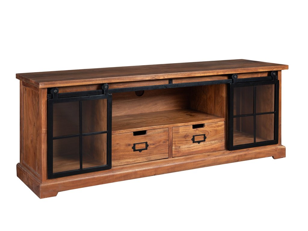 Vitrína HERITAGE 160cm, černé kovové posuvné dveře, akácie, hnědá