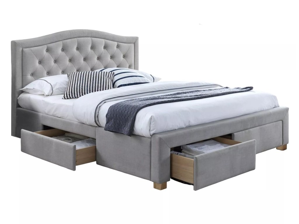 Postel, látka, barva: šedá, čalounění 76. Součástí je rám s pružinovými lamelami upevněnými na flexibilních úchytech a 4 zásuvky. Rozměr matrace: 160x200cm (cena bez matrace).