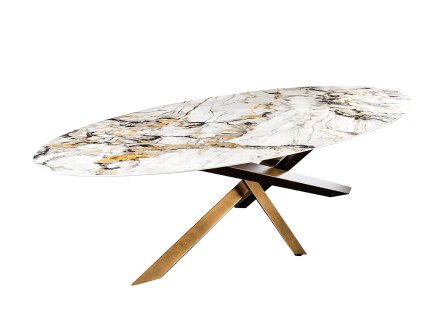 Jídelní stůl SCULPTURE 280 cm, oválný bronzový rám s keramickou deskou, vícebarevný mramorový vzhled
