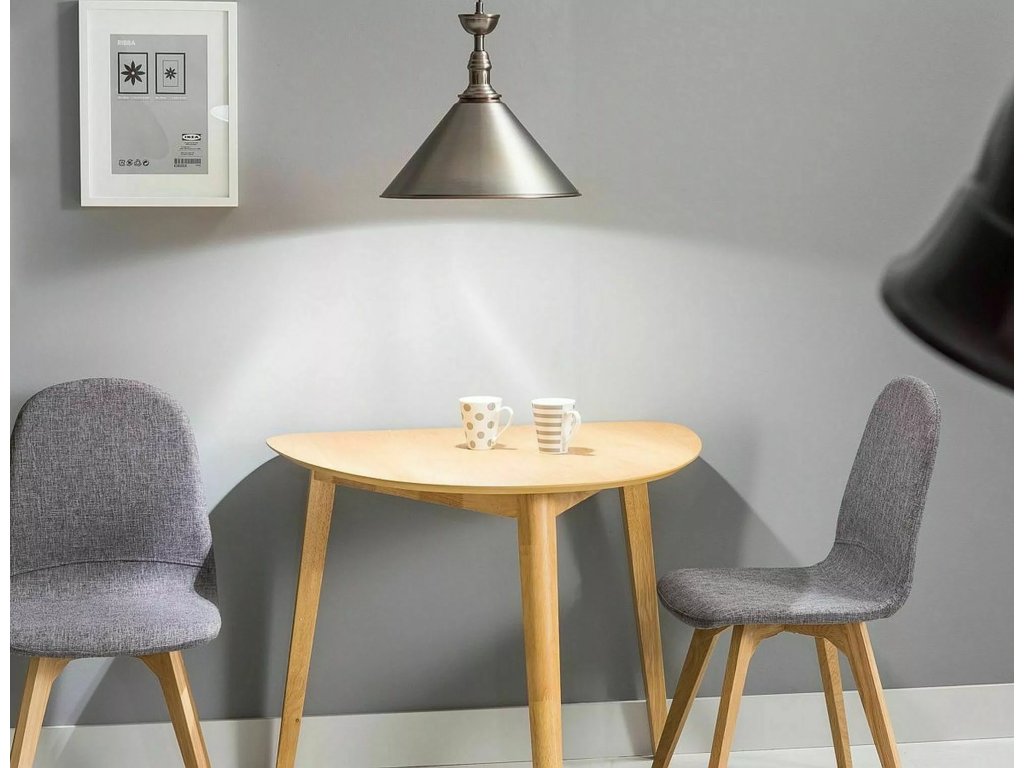 Unikátní třínohý stůl s půlkulatou deskou – perfektní řešení pro malé kuchyně. Deska: MDF + přírodní dýha, rám: dřevo, barva: dub/dub.
