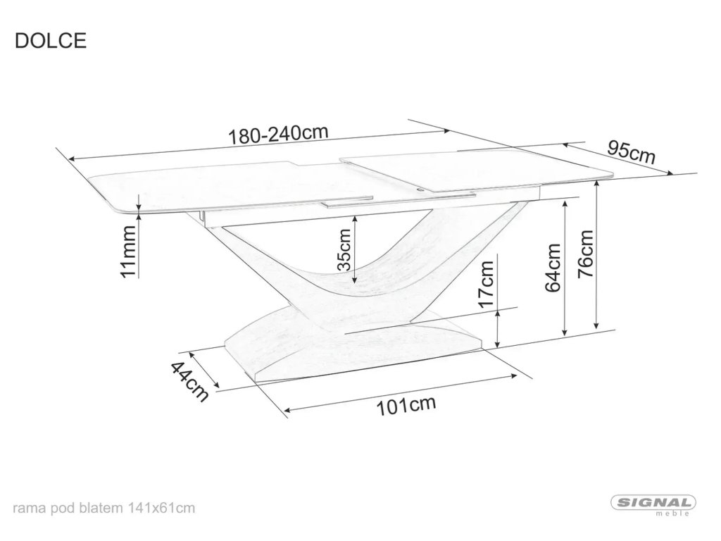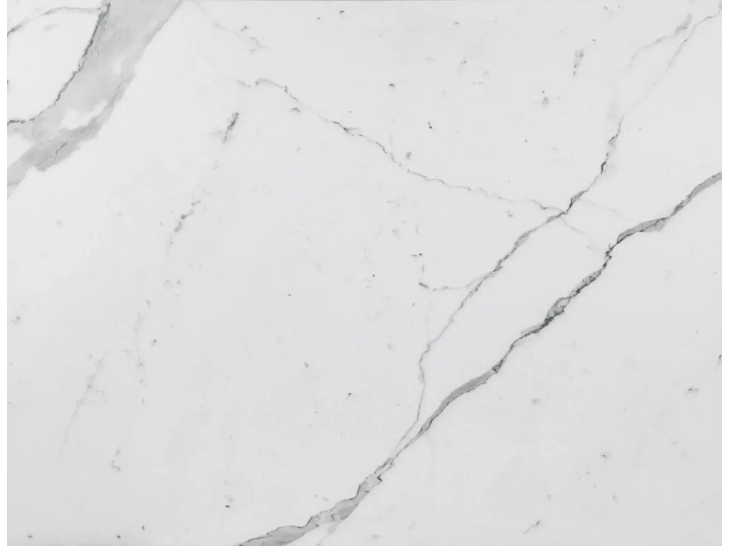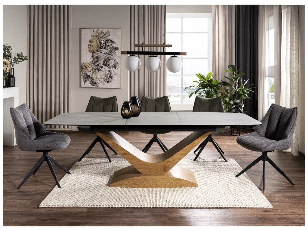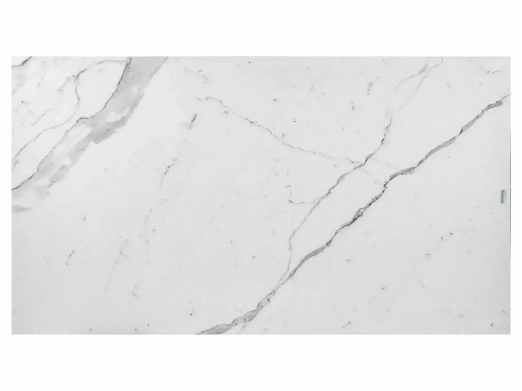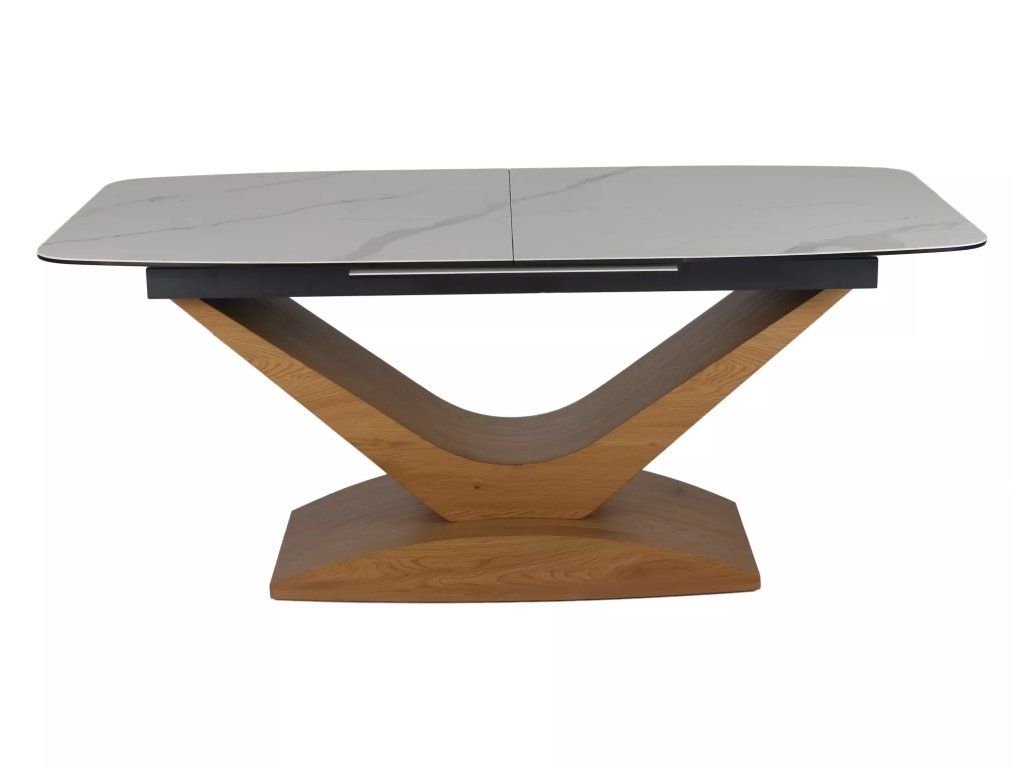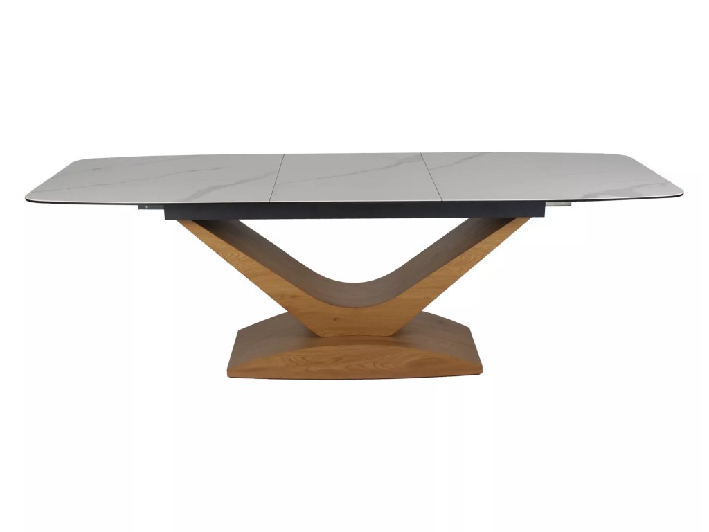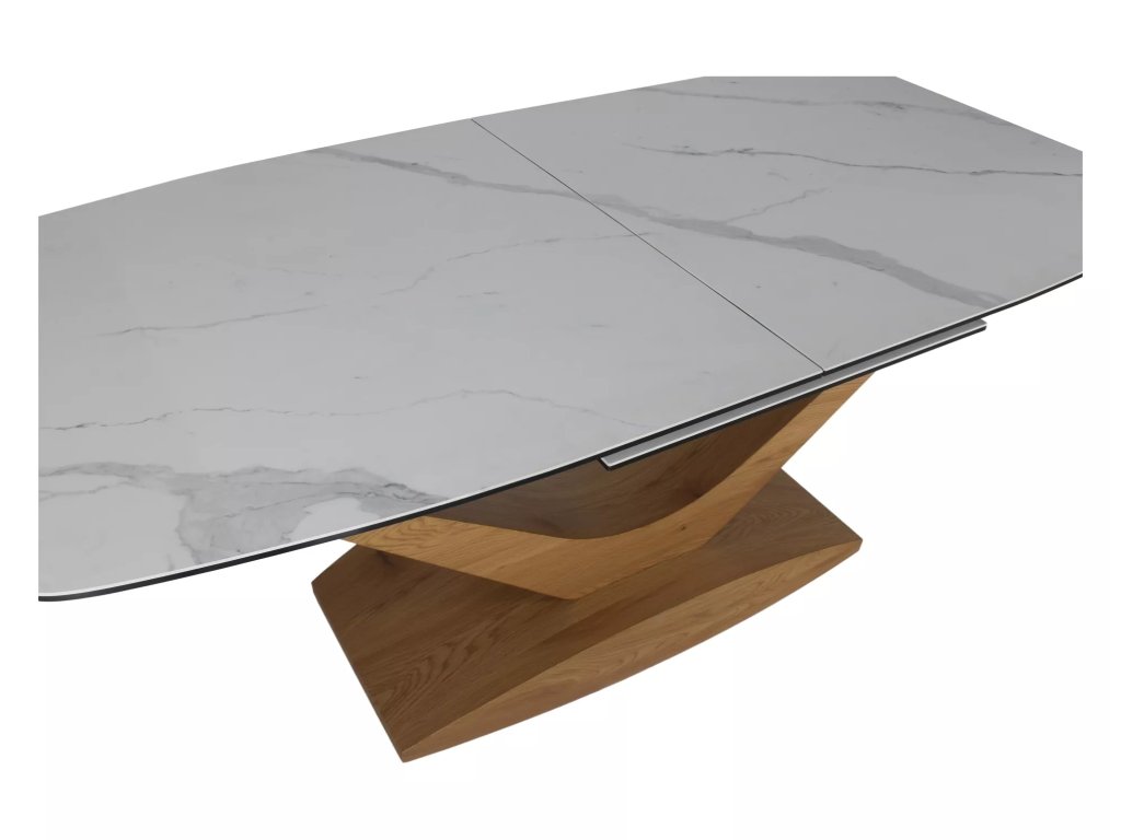 Rozkládací stůl, deska: tvrzené sklo + keramika Statuario Venato, rám: MDF + dýha, barva: matná bílá / dub.