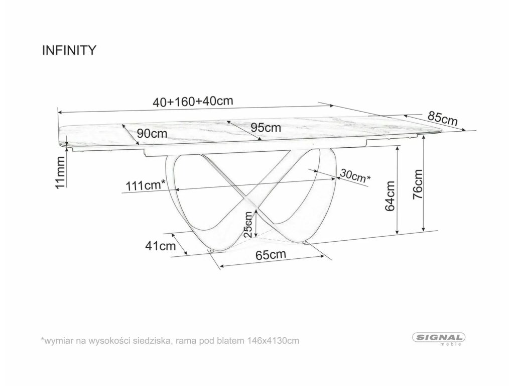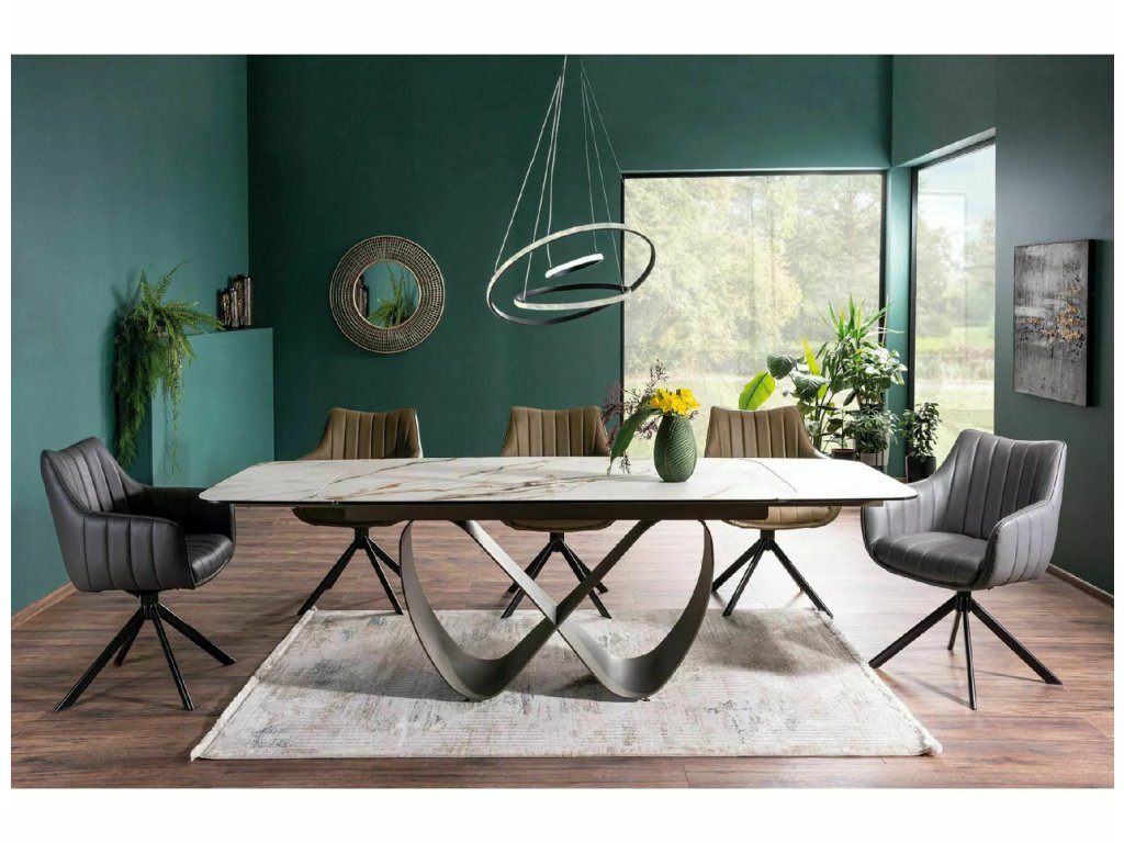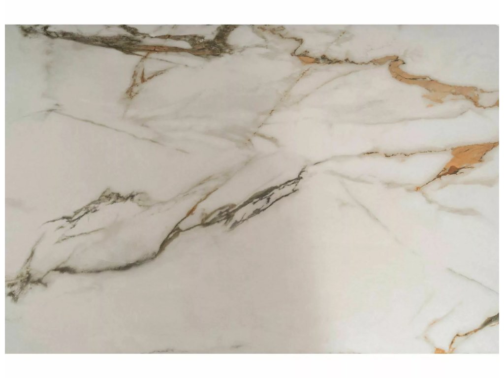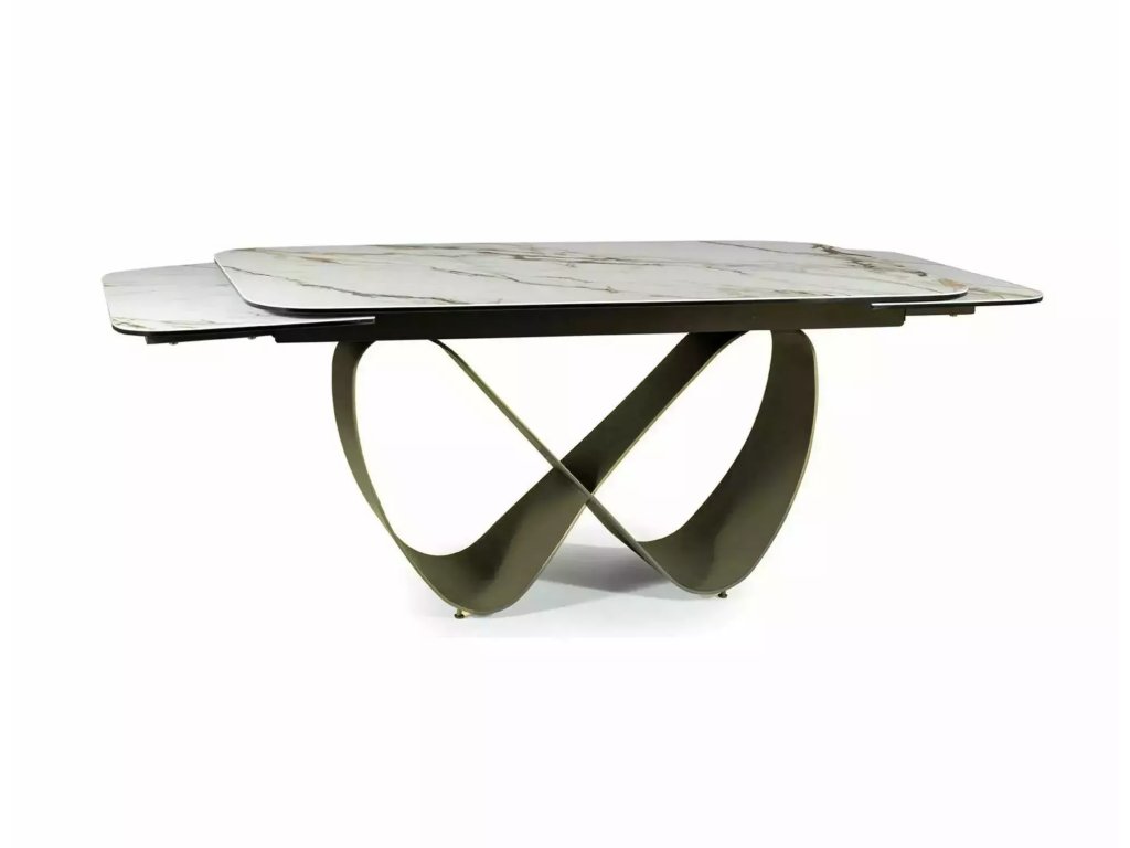 Rozkládací stůl, deska: tvrzené sklo + španělská keramika, AMBER BIANCO, rám: kov, barva: bílá / měď.