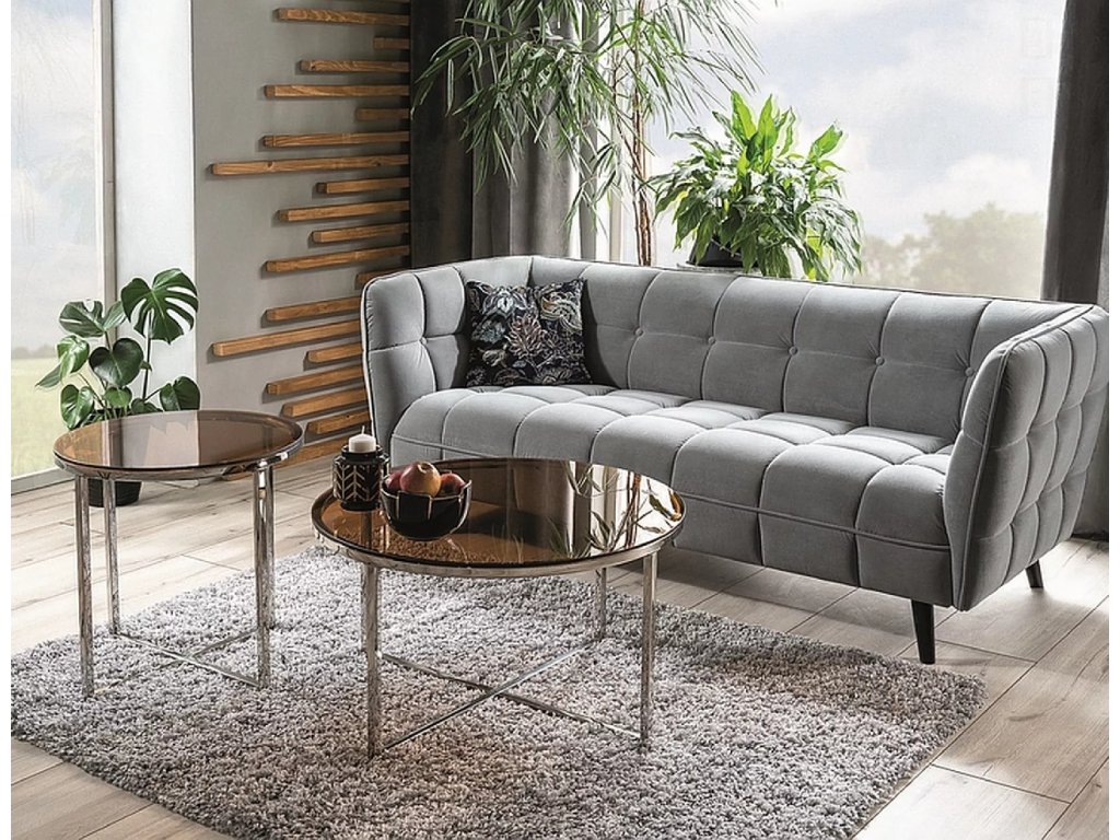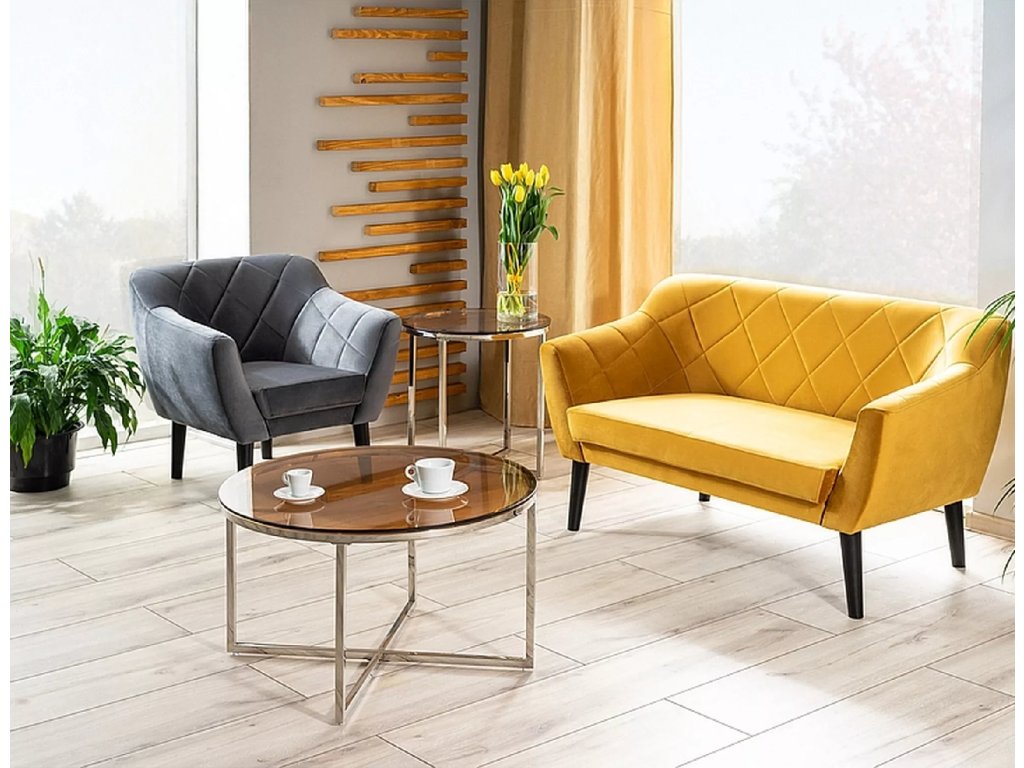 Konferenční stolek, deska: jantarově tvrzené sklo, rám: nerezová ocel, barva: stříbrná.