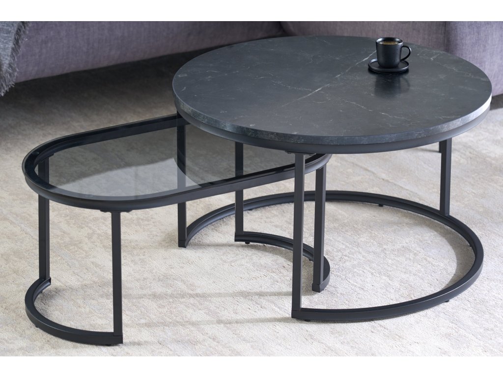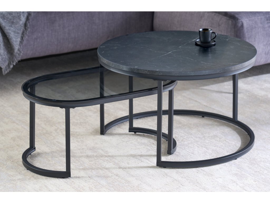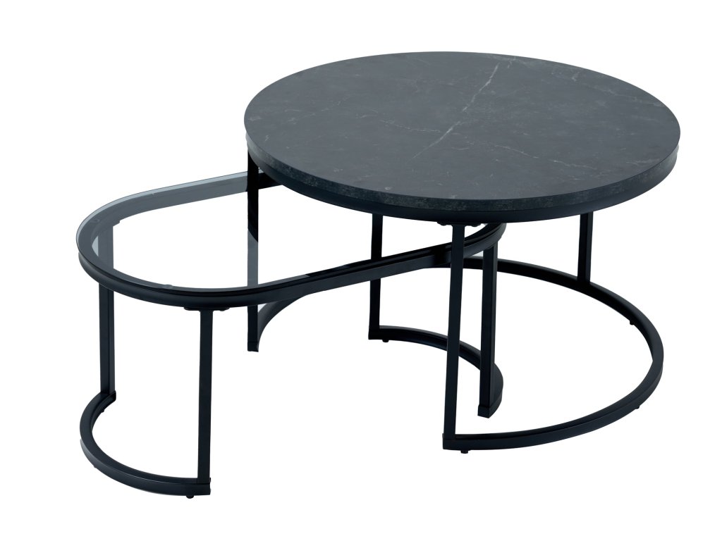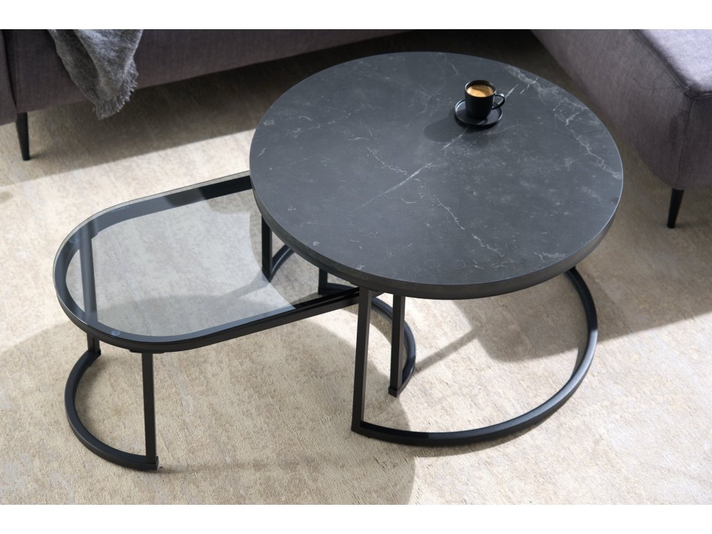Konferenční stolek ELEGANCE 70cm sada 2 ks mramorového vzhledu a kouřového skla černé