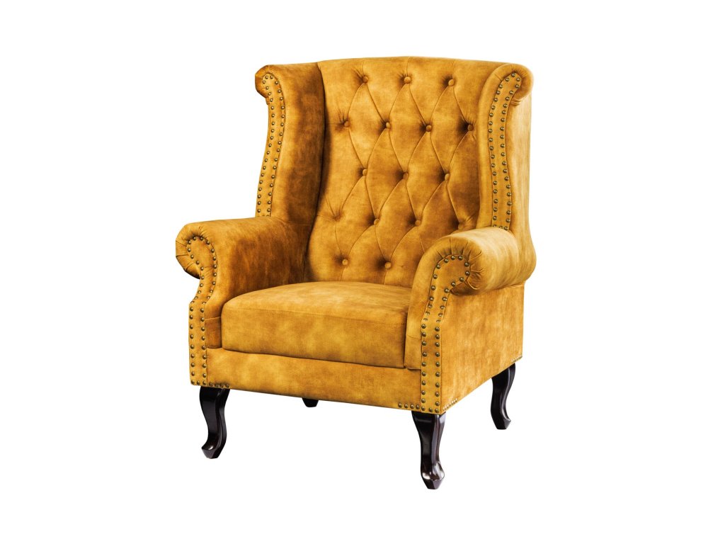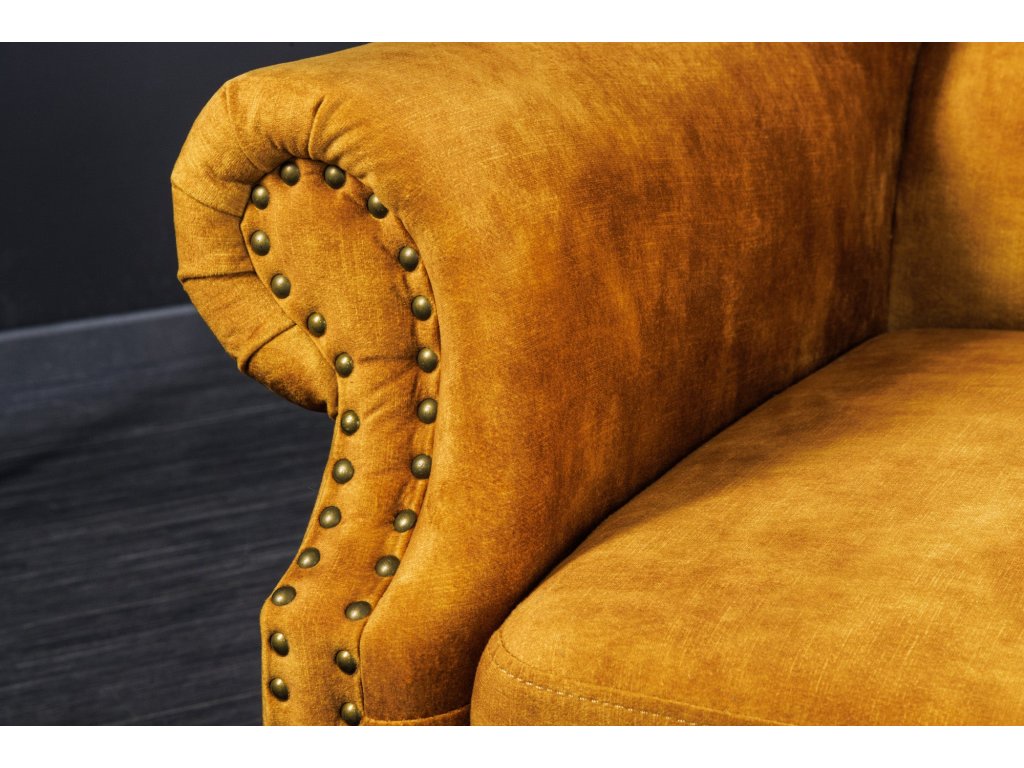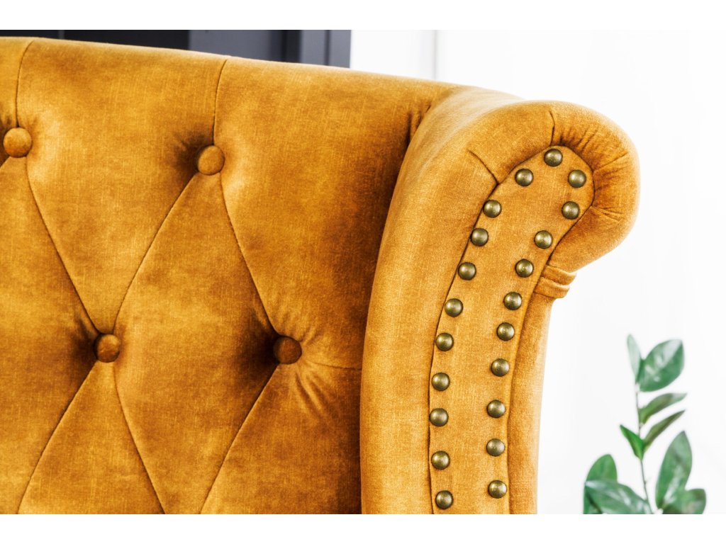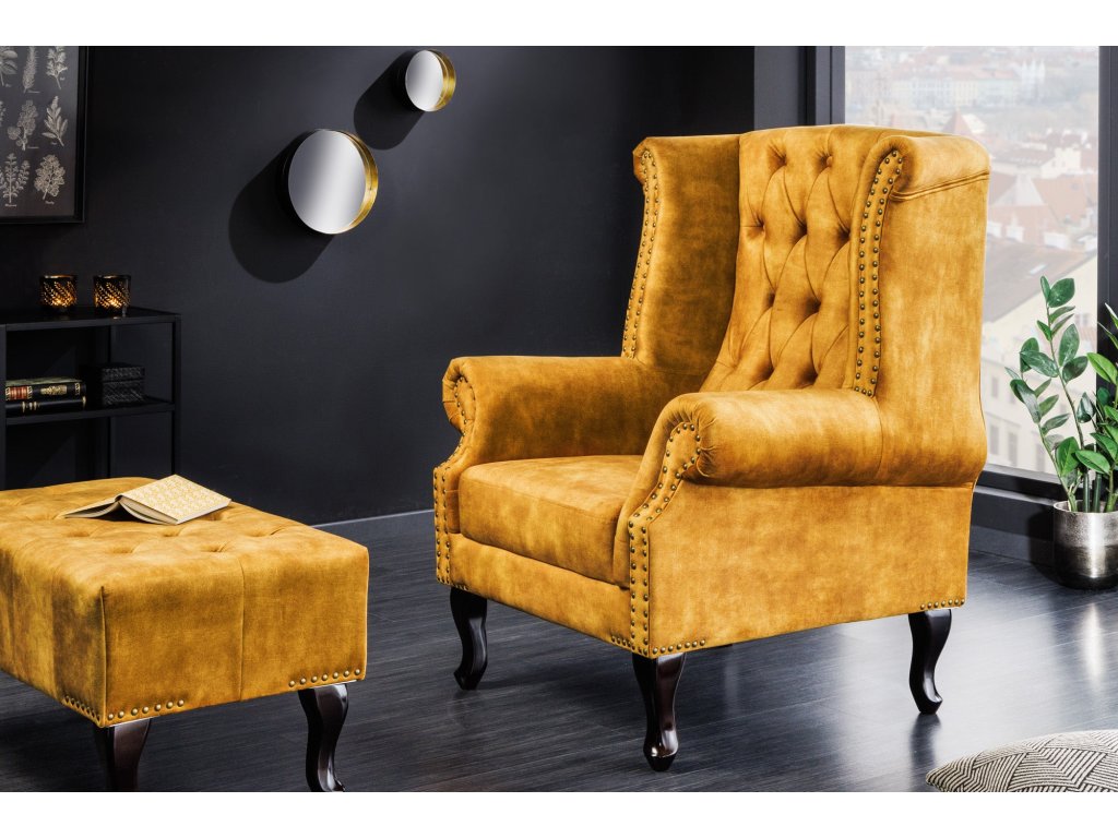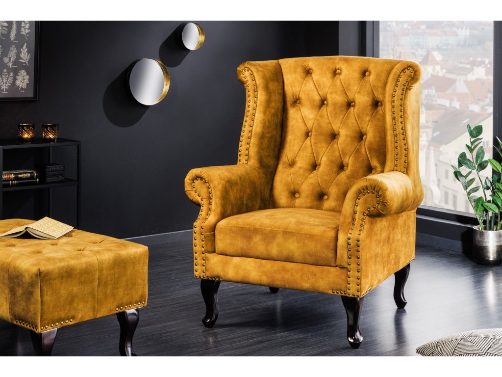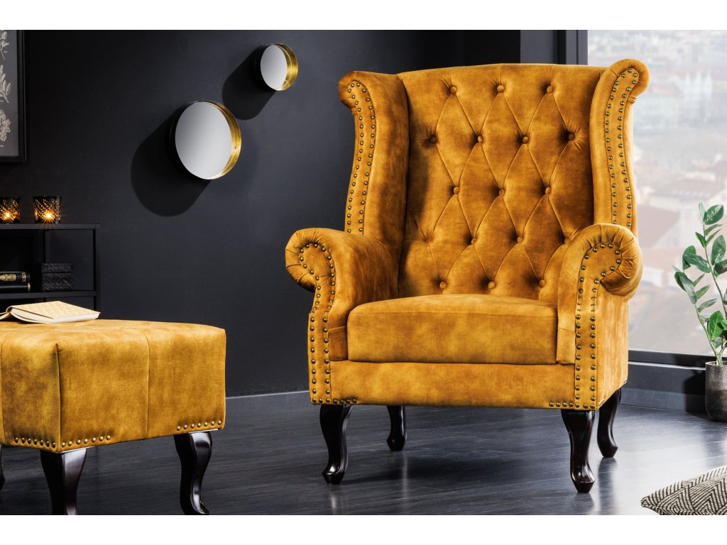 Křeslo ušák CHESTERFIELD starožitný vzhled sametově hořčicově žluté