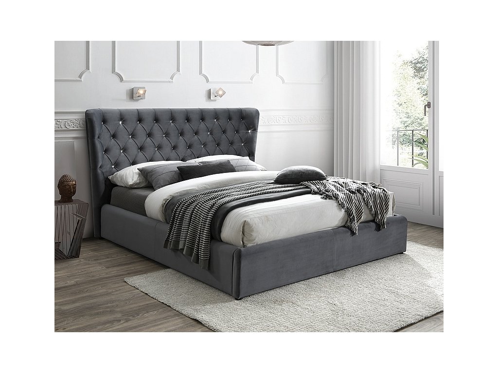 Postel, sametová látka, barva: šedá, čalounění Bluvel 14. Součástí postele je rám ze zakřivených lamel upevněných na flexibilních držácích. Rozměr matrace: 160x200cm (cena bez matrace).