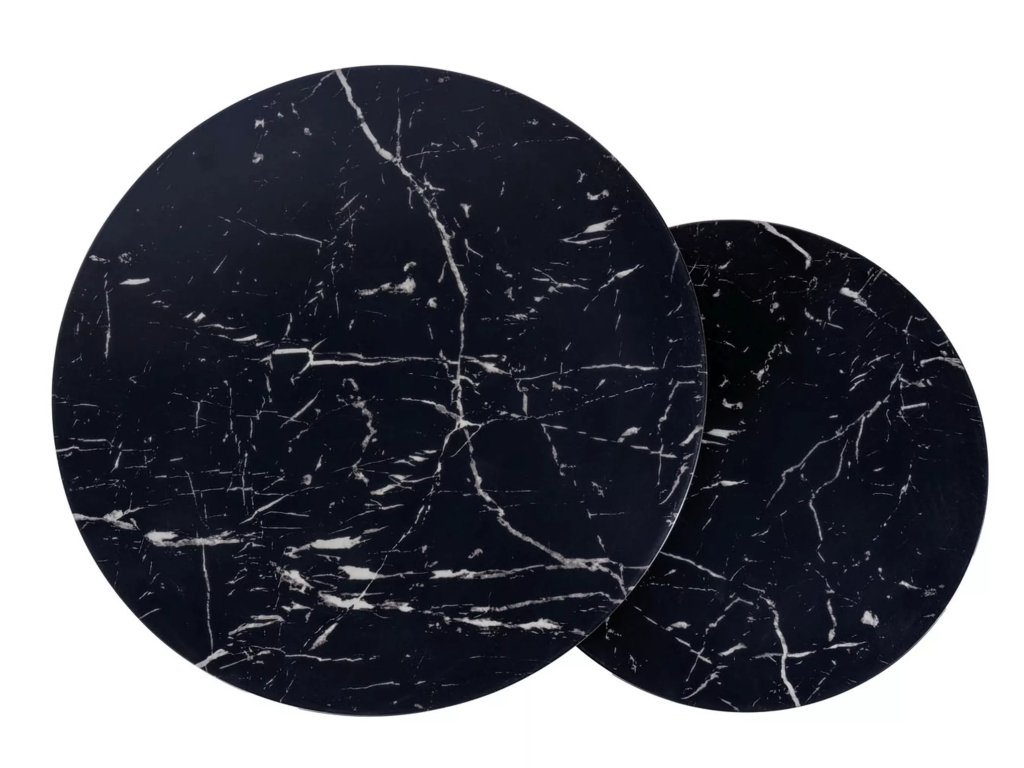 Sada konferenčních stolků, deska: MDF + dýha s mramorovým efektem, rám: kov, barva: černá / černá. Rozměry menšího stolku: průměr: 43 cm; výška: 35 cm.