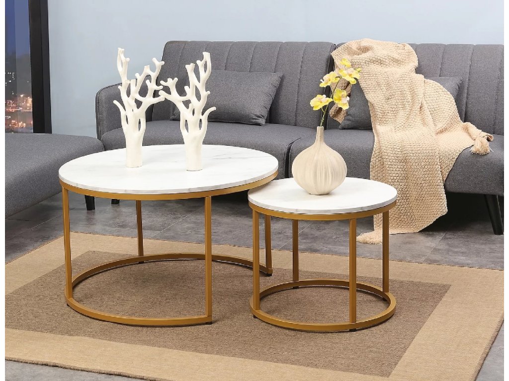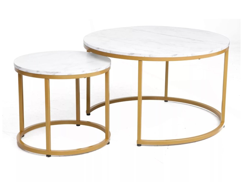 Sada konferenčních stolků, deska: laminovaná deska, rám: kov, barva: bílá, mramorový efekt / zlatá. Rozměry menšího stolku: průměr: 48 cm; výška: 42 cm.
