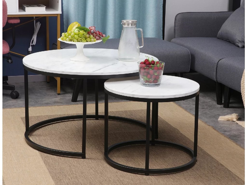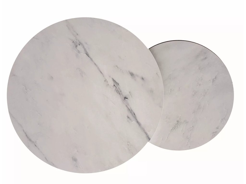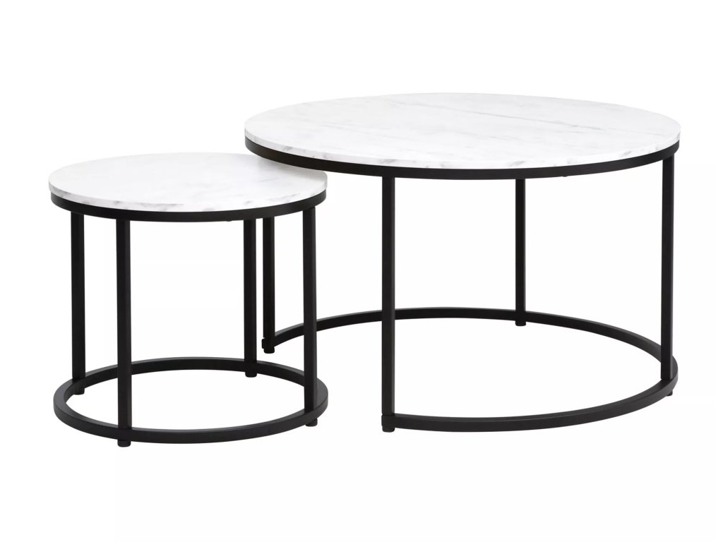 Sada konferenčních stolků, deska: laminovaná deska, rám: kov, barva: bílá, mramorový efekt / matná černá. Rozměry menšího stolku: průměr: 48; výška: 42 cm.