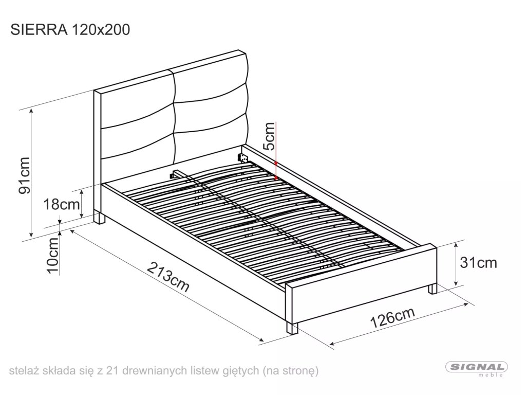 Rozměry postele: A - 213, B - 126, C - 120x200, D - 10, E - 5, F - 18, G - 31, V - 91 cm.