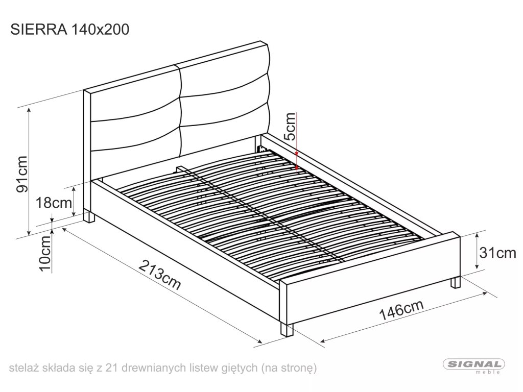 Rozměry postele: A - 213, B - 146, C - 140x200, D - 10, E - 5, F - 18, G - 31, V - 91 cm.