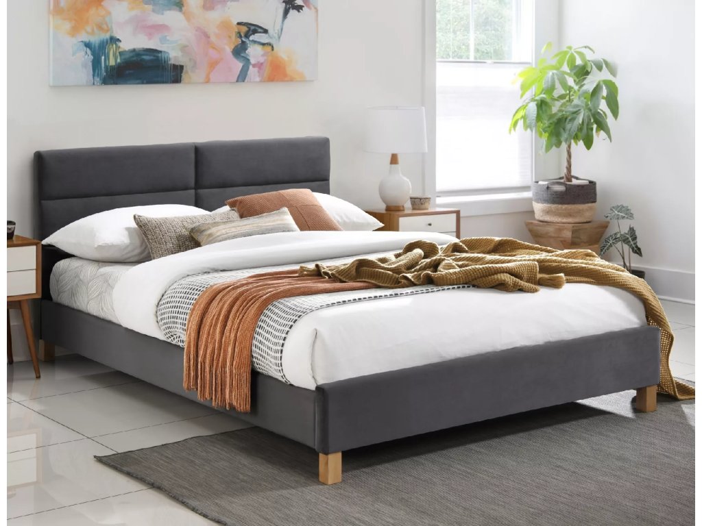 Postel, sametová látka, barva: 150 šedá/dubové čalounění. Součástí je rám ze zakřivených lamel s flexibilními držáky. Rozměr matrace: 140x200cm (cena bez matrace).