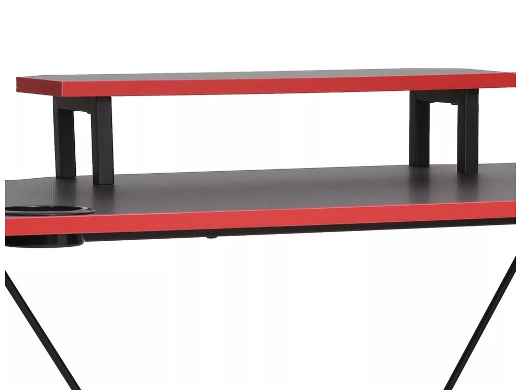 Psací stůl, deska: laminovaná deska, rám: kov, barva: černá + červená horní hrana. Držák na nápoje, sluchátka. Výška s výsuvem: 88 cm.