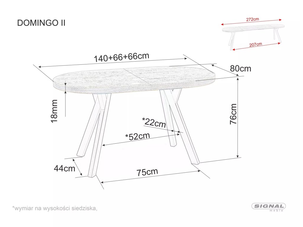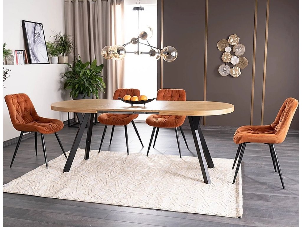 Rozkládací stůl, deska: přírodní dýha, rám: kov, barva: dub/černá. Stůl se dvěma dalšími vložkami/vrchními díly po 66 cm, nastavitelná délka stolu: 140, 206 nebo 272 cm. Tloušťka dýhy: 0,6 mm. Poznámka: vložky jsou uloženy odděleně (pod deskou není vyhrazený prostor).