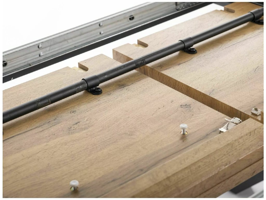 Rozkládací stůl, deska: MDF + dýha, rám: matný kov, barva: dub artisan / černá. Dvojitý motýlkový mechanismus: 2x40cm.
