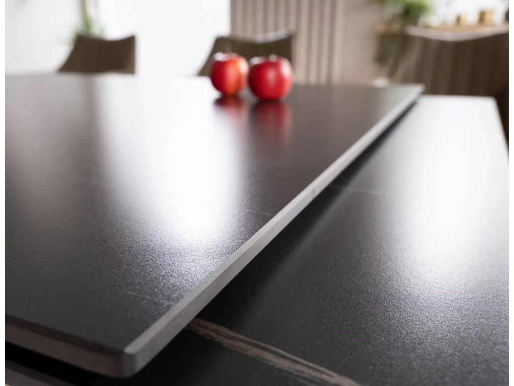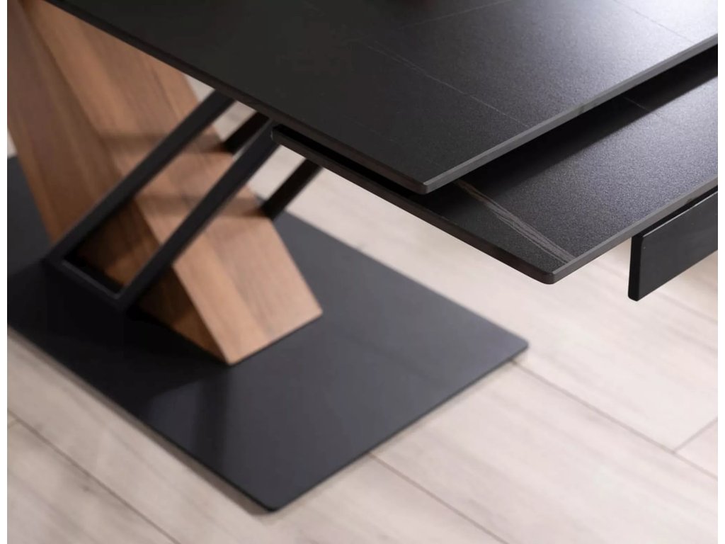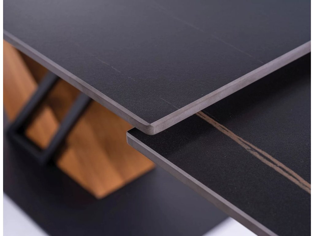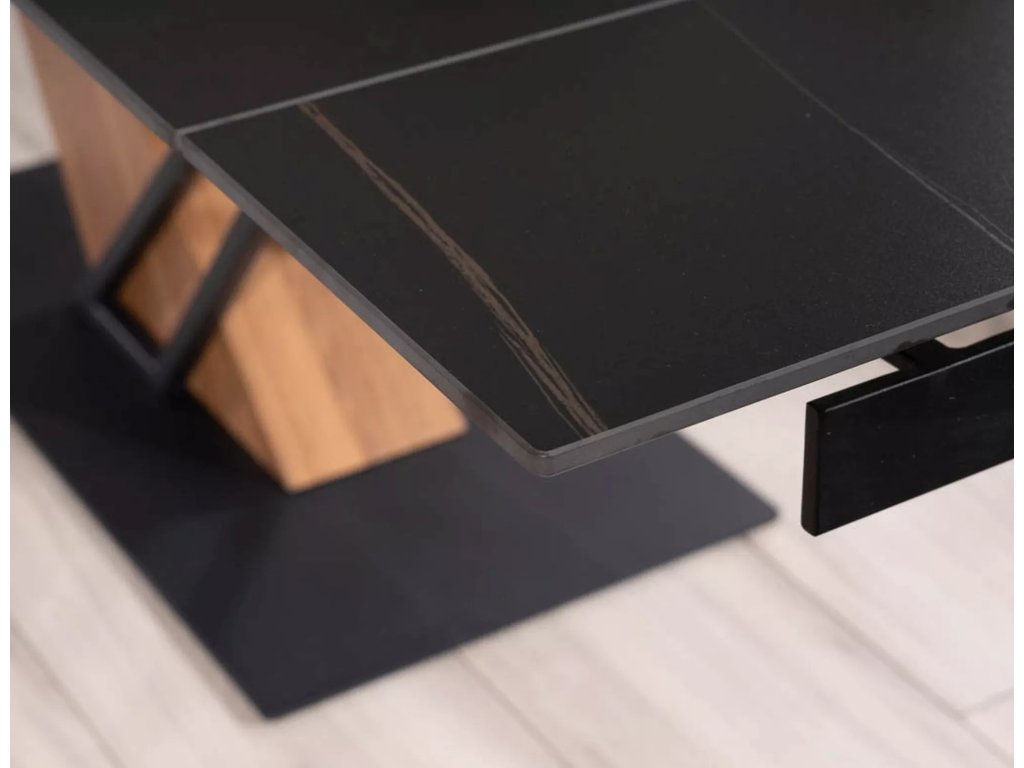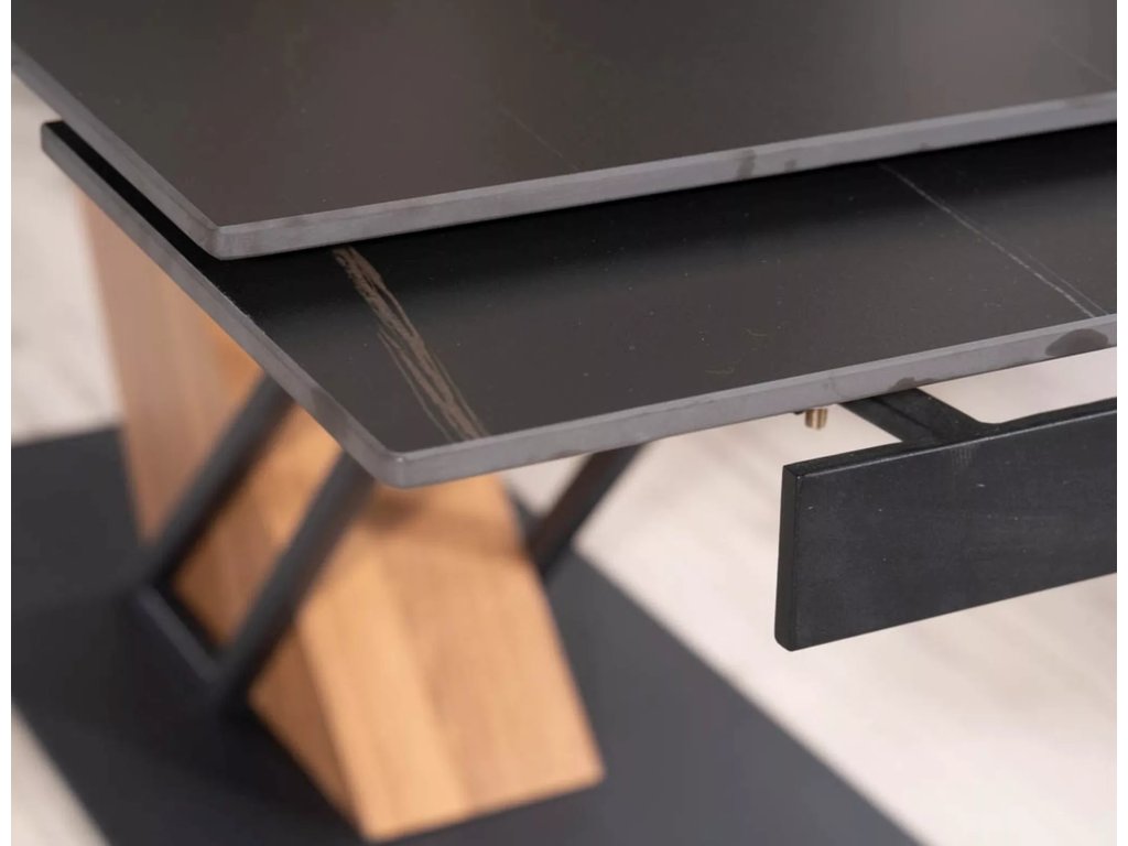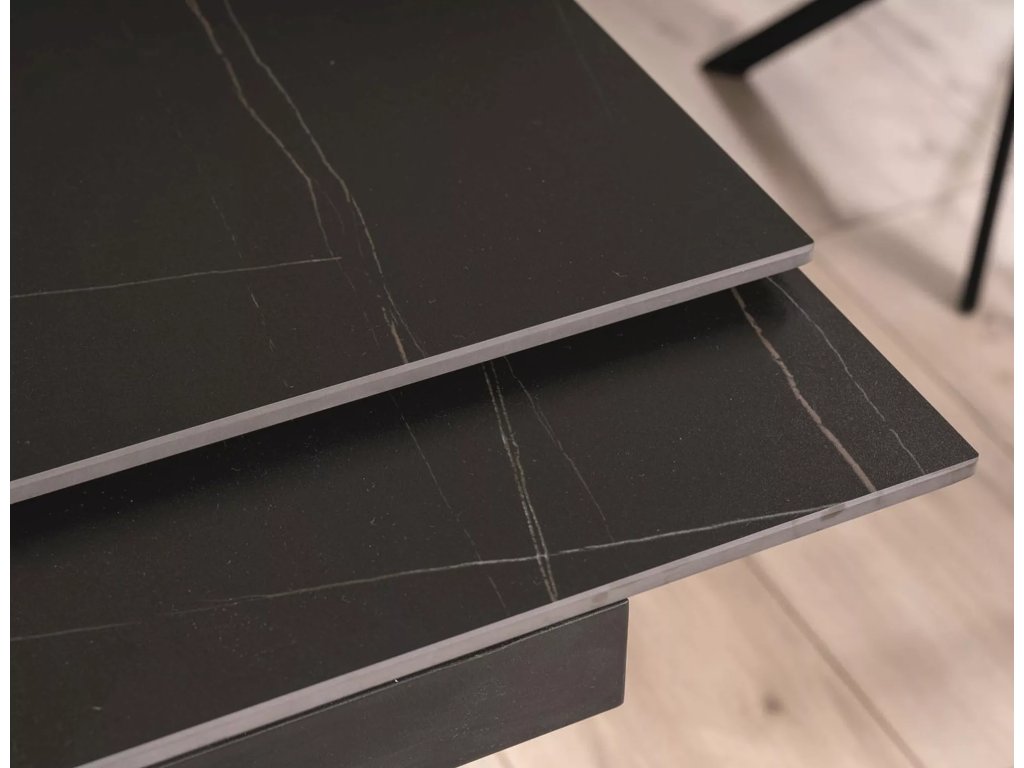 Rozkládací stůl, deska: keramika, mramorový efekt, rám: MDF + dýha + kov, barva: černá / jasan + matná černá.