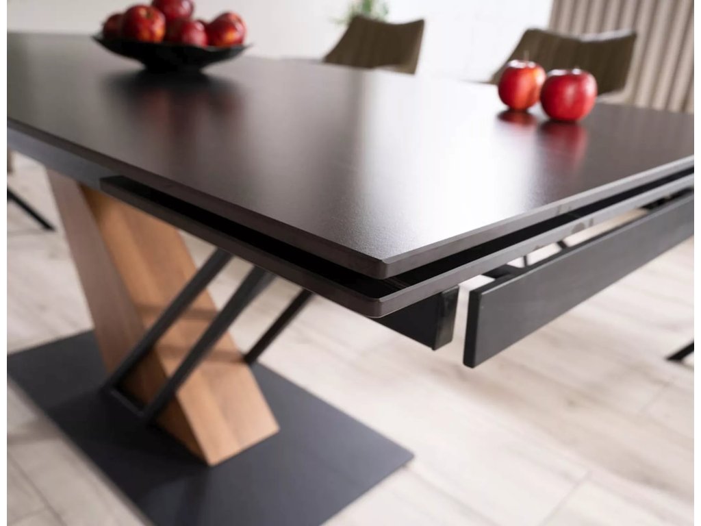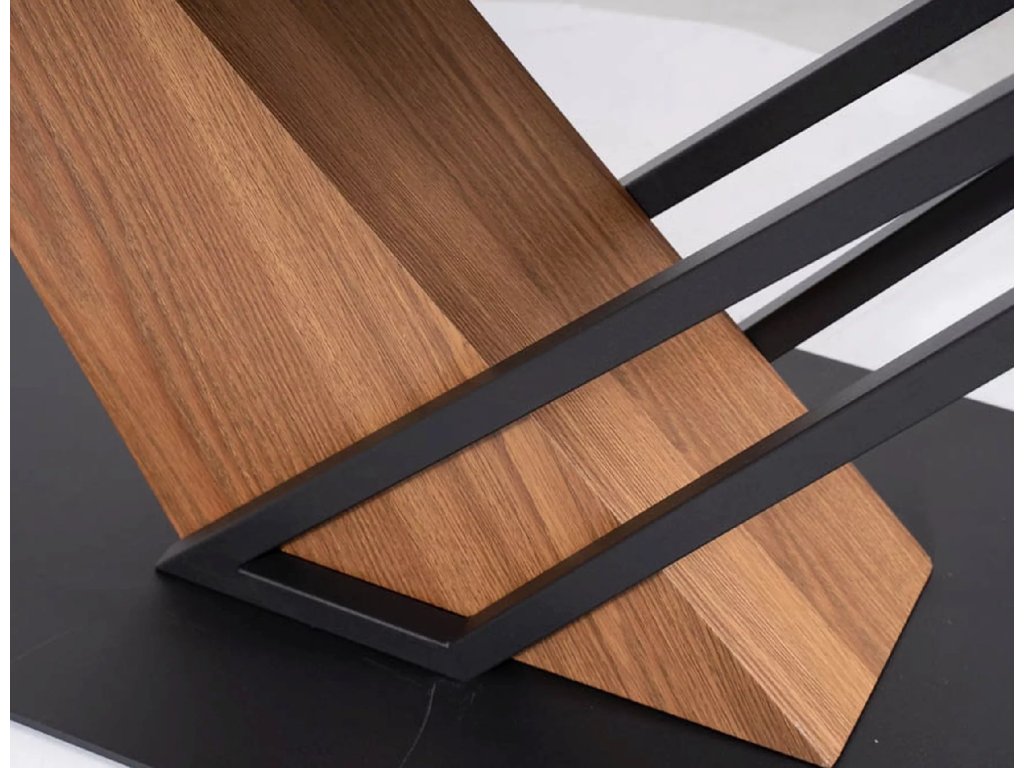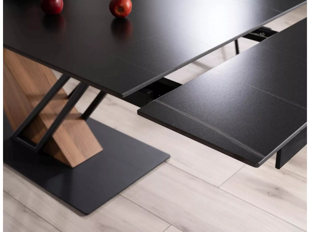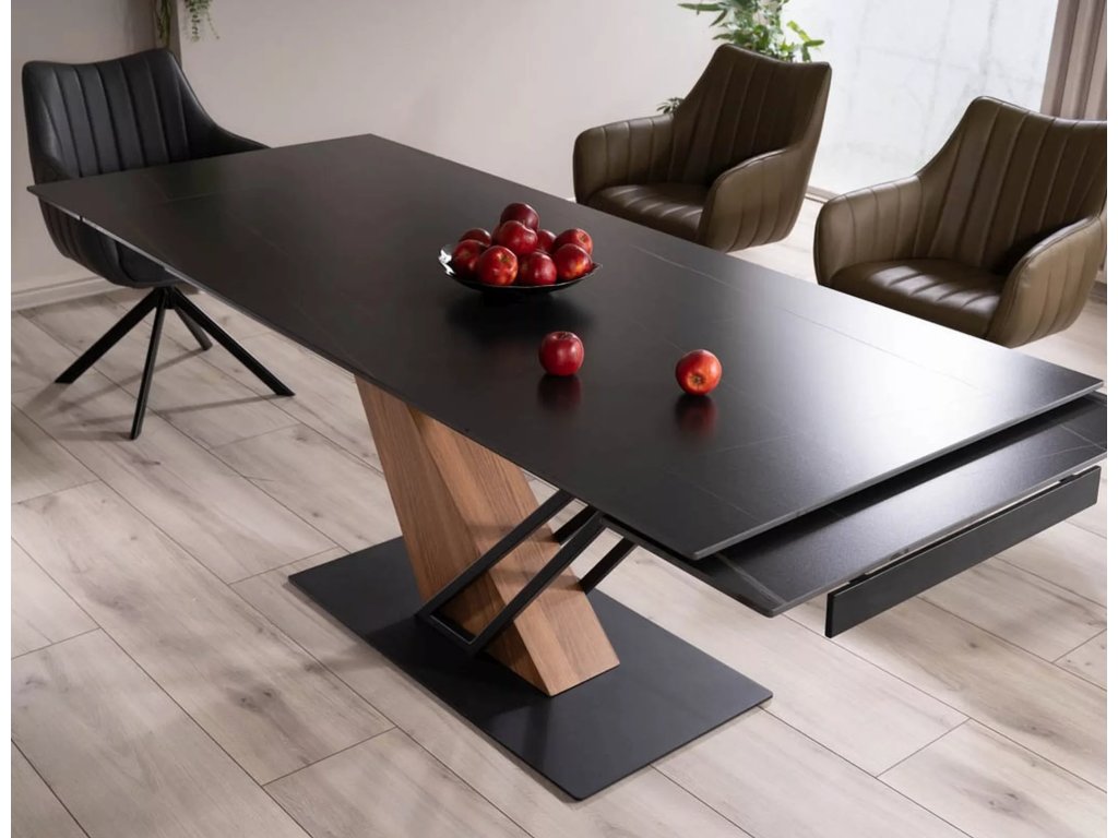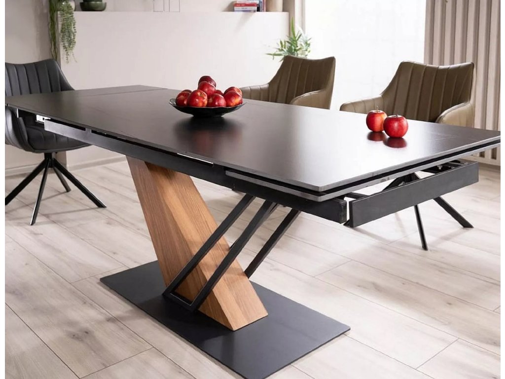 Rozkládací stůl, deska: keramika, mramorový efekt, rám: MDF + dýha + kov, barva: černá / jasan + matná černá.