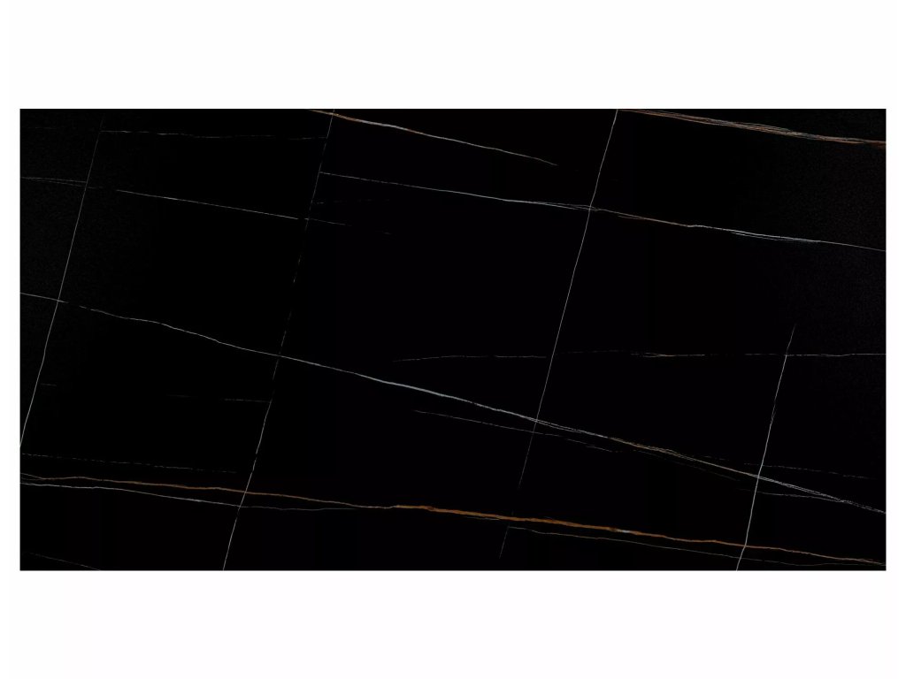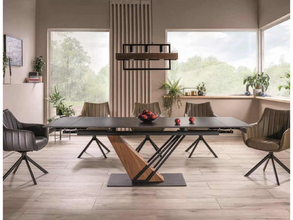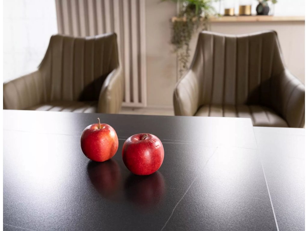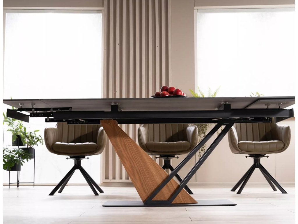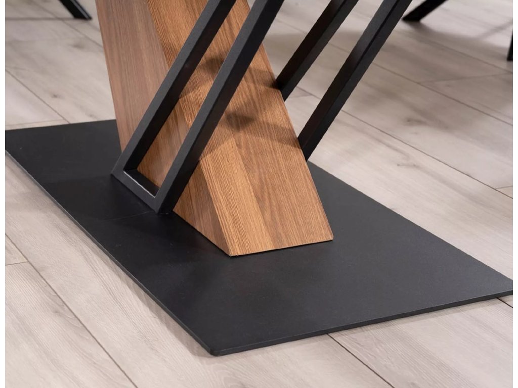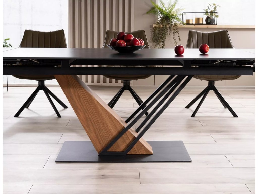Rozkládací stůl, deska: keramika, mramorový efekt, rám: MDF + dýha + kov, barva: černá / jasan + matná černá.