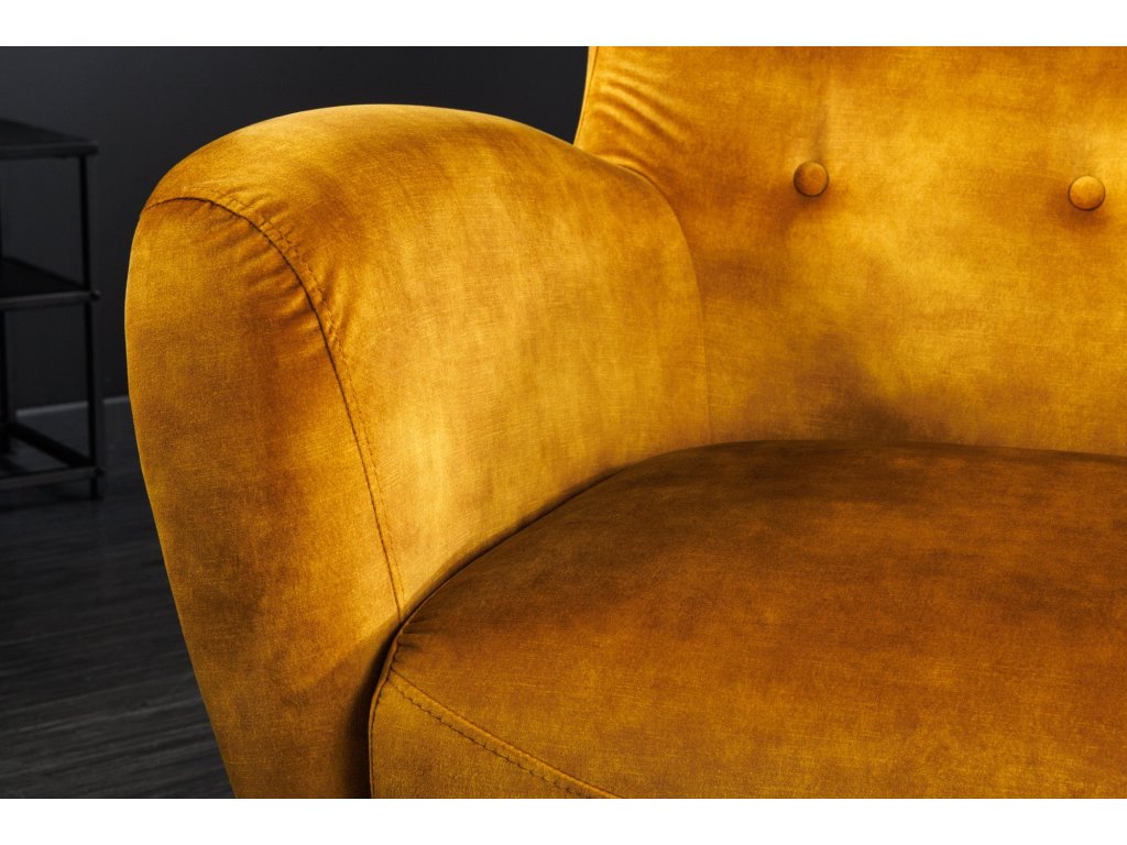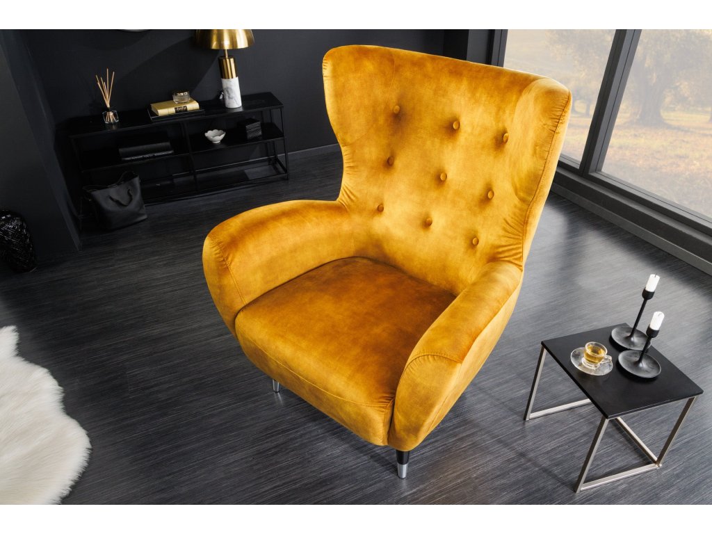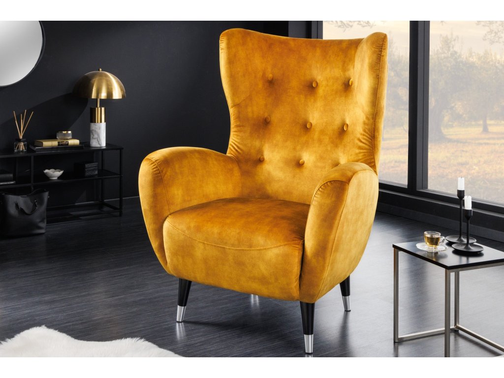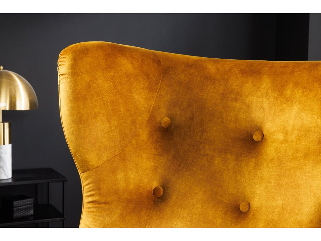 Křeslo s ušákem DON se stříbrnými krytkami, sametově hořčicově žluté