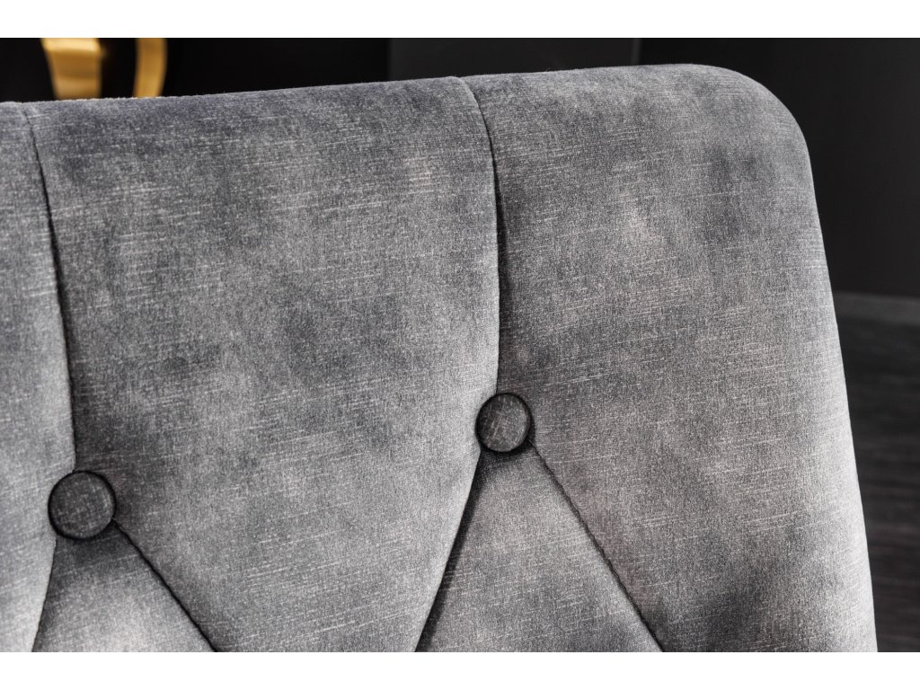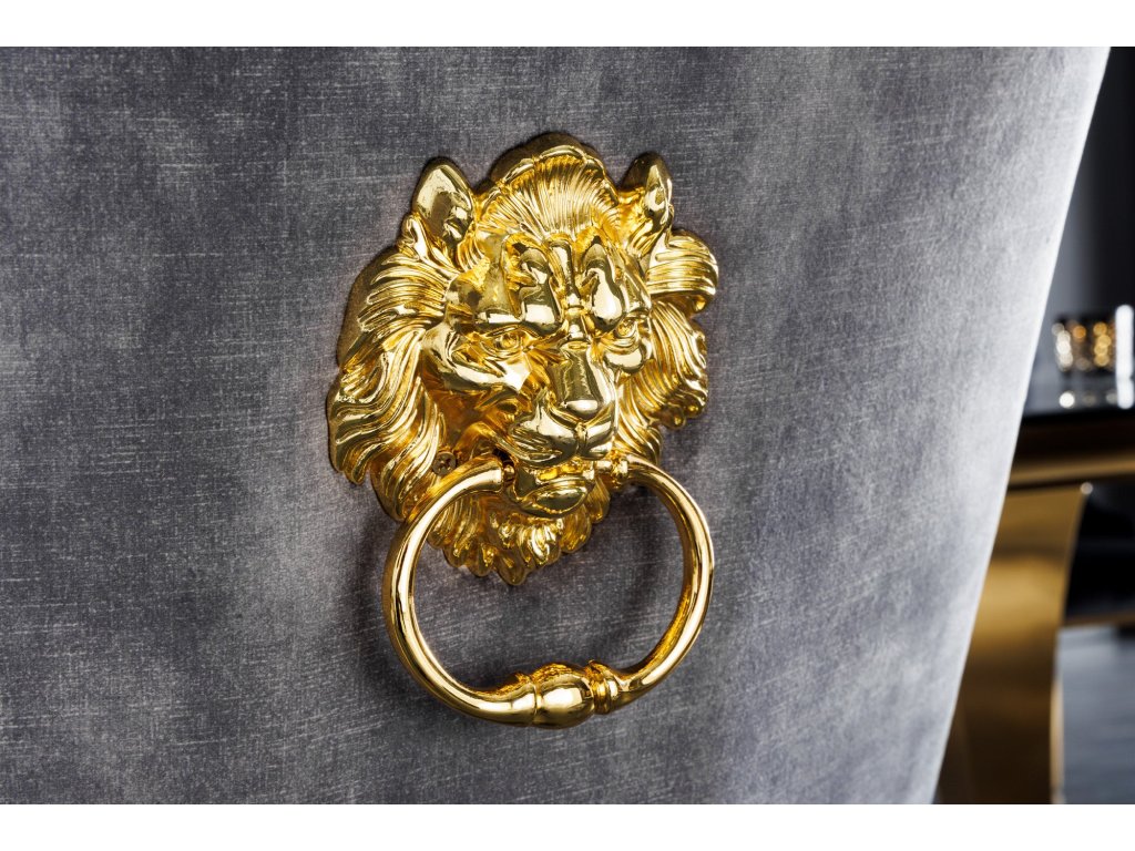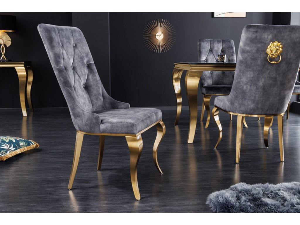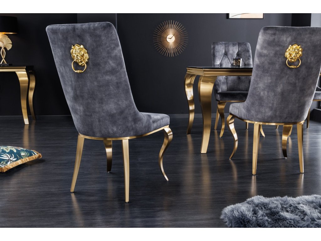 Židle MODERN BAROCK se sametově šedými zlatými nohami se lví hlavou v barokním stylu